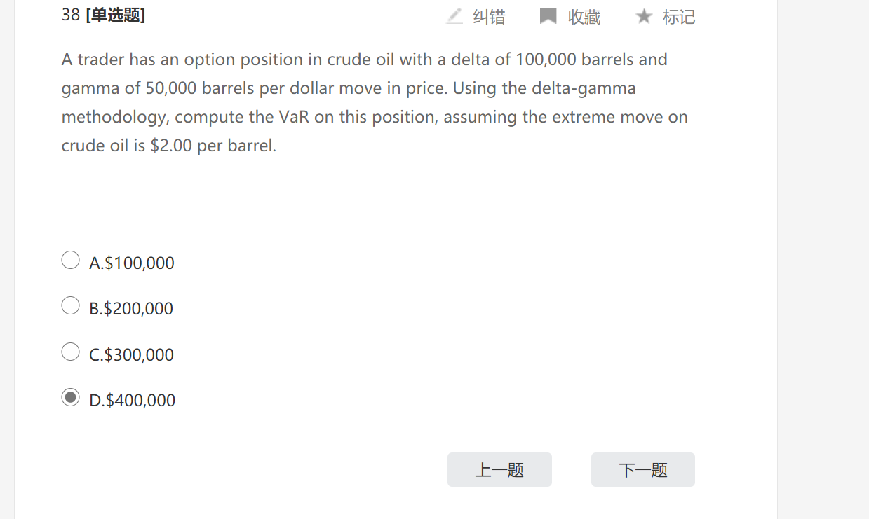 同学,这个题目考察Δ-Γ法求VAR的公式,VAR=Δ*ds-0.5*Γ*(ds)^2=100000*2-0.5*50000*(2^2)=100000