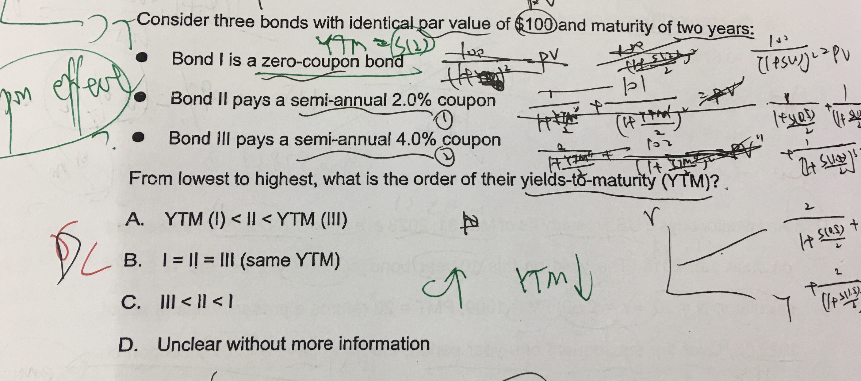 同学,对于溢价债券,付的券息越高,YTM越小,YTM可以看做是即期利率的加权平均,权重就是每笔现金流对应的权重。Coupon rate就是用来计算每笔现金流的,coupon rate 越高,现金流权重越高。YTM更靠近期初的利率。如果利率倾斜向上,YTM靠近期初就会小;如果利率倾斜向下,YTM靠近期初就会变大。如果即期利率平,则YTM=Spot rate。 票息率和YTM是反向相关的。这就是coupon effect