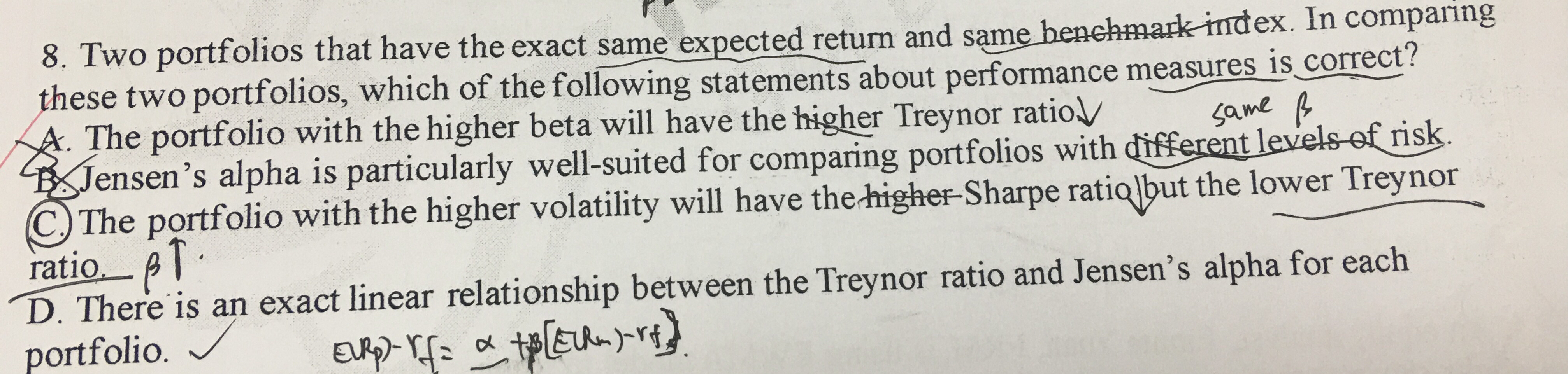 同学,treynor ratio更适用于完全分散化后的投资组合,sharp ratio对于所有投资组合都适用,因为考虑了所有风险;当波动率增加,意味着风险增加,但对treynor ratio来说,因为只考虑系统性风险,所以不影响