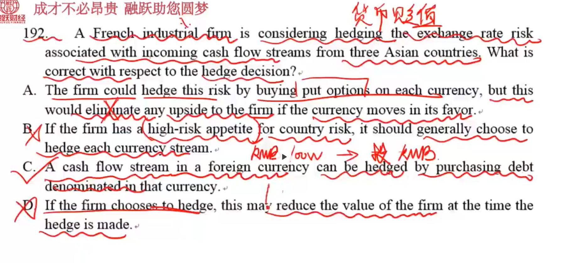 同学,C选项意思是收外汇,又把外汇以买当地债券的形式花出去,不存在外币与本币的转换,所以没有了外汇风险;D选项里的value是对公司整体价值的影响,对冲可降低公司价值波动性,可增加公司价值