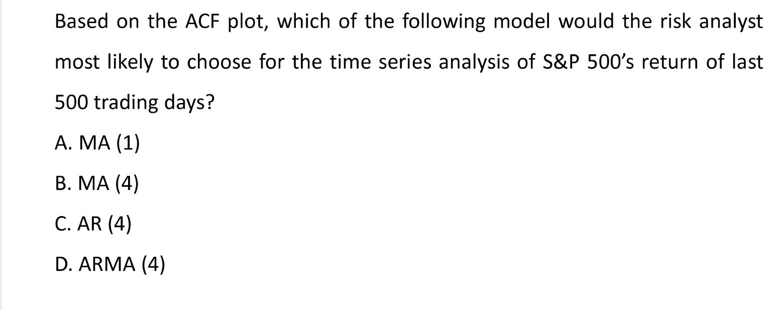 同学你好,根据题干图形可知其ACF在第四期末出现截尾特征(在一定区间内的波动算截尾),这是MA模型的特征,因为是第四期才出现截尾,所以是MA(4)。
