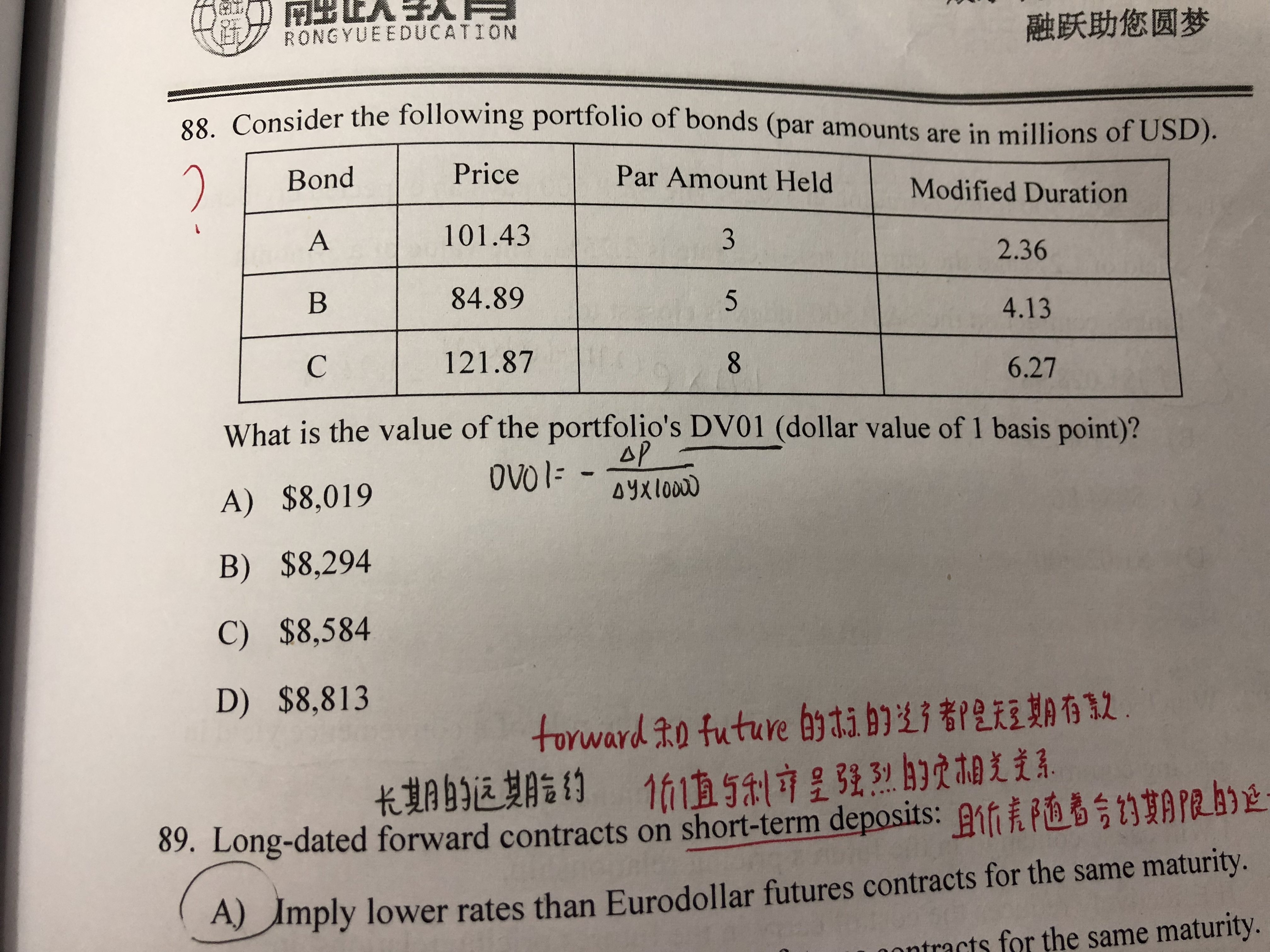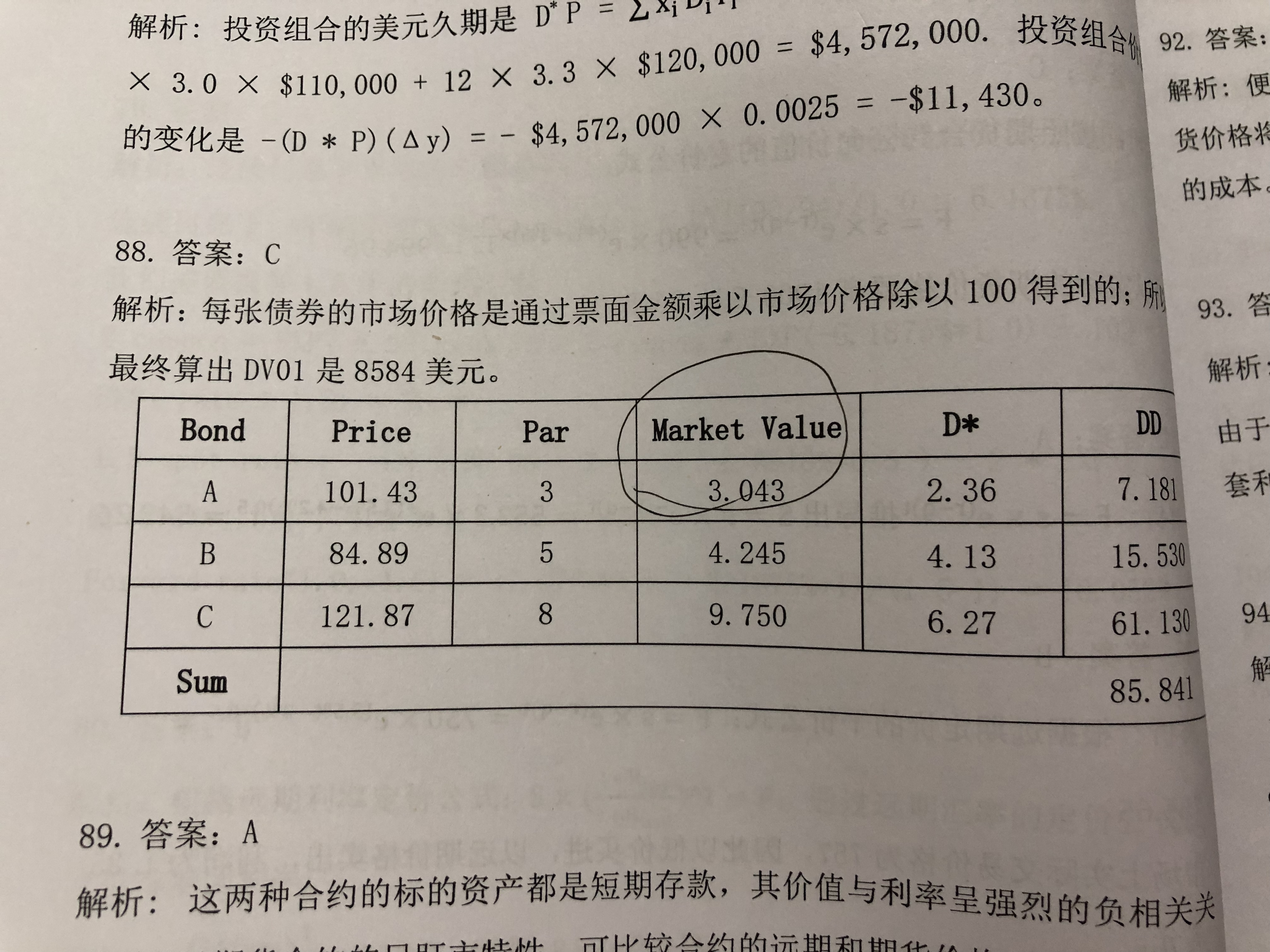 同学,Market value因为债券一般是一手 100000; 这里的price 101.43是面值,(101.43/100)* 3 = 3.0429, 相当于是3.0429手,市场价值就是 3.0249*100000 = 30429,DD = D*P= 2.36*3.043 = 7.18;每个数据就是这样来的可以 自己算一下B,C