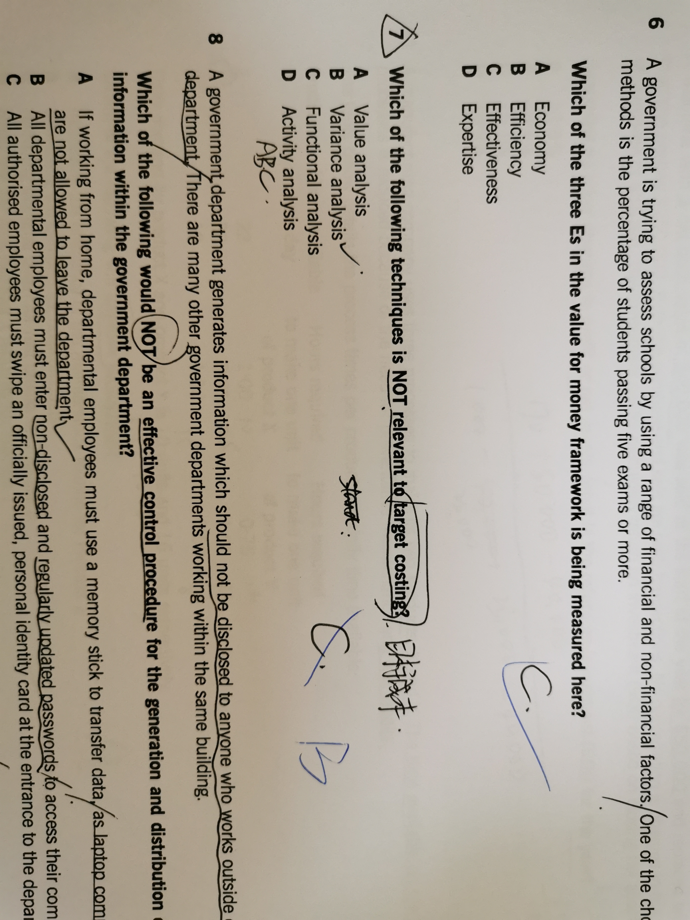 同学,题目描述以下哪个不是跟目标成本法相关的技术?选项A价值分析,目标成本法在确定好target cost之后就要对现有的cost进行价值分析,把不重要的成本消减。选项C职能分析和选项D行为分析都是一样的,角度不同,都是为了削减成本,跟目标成本法相符。