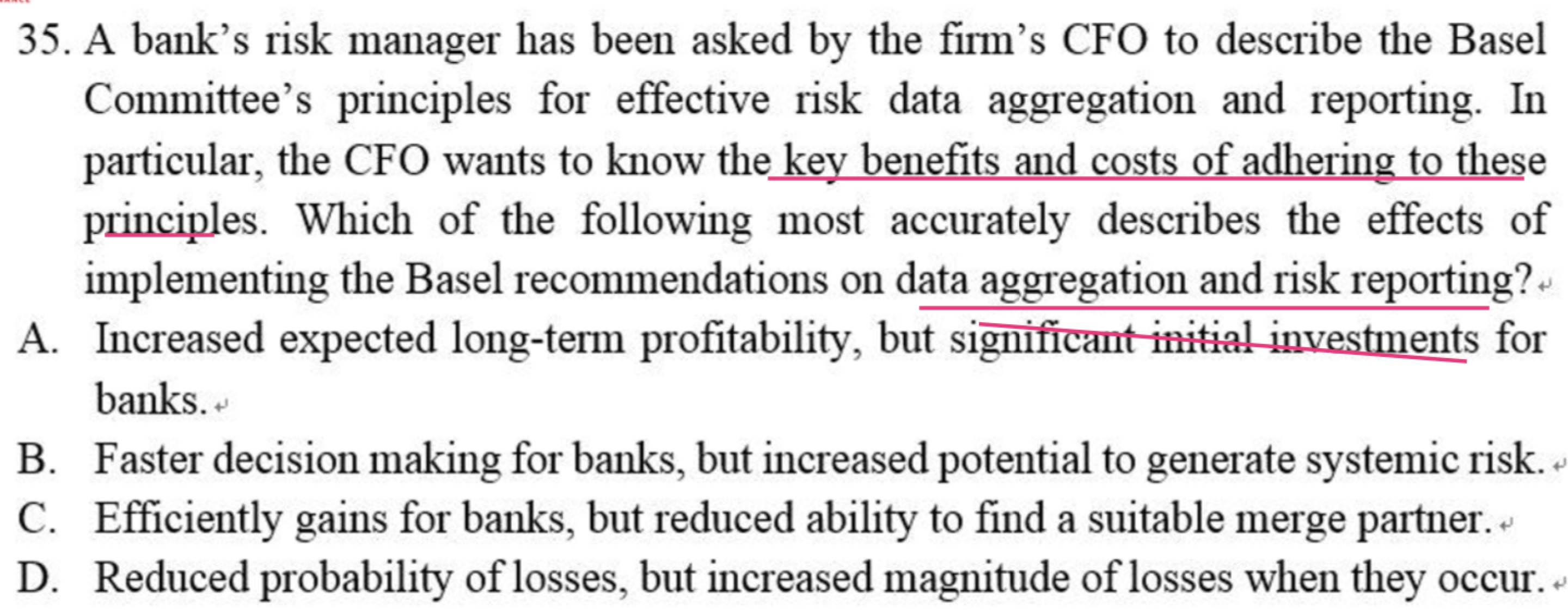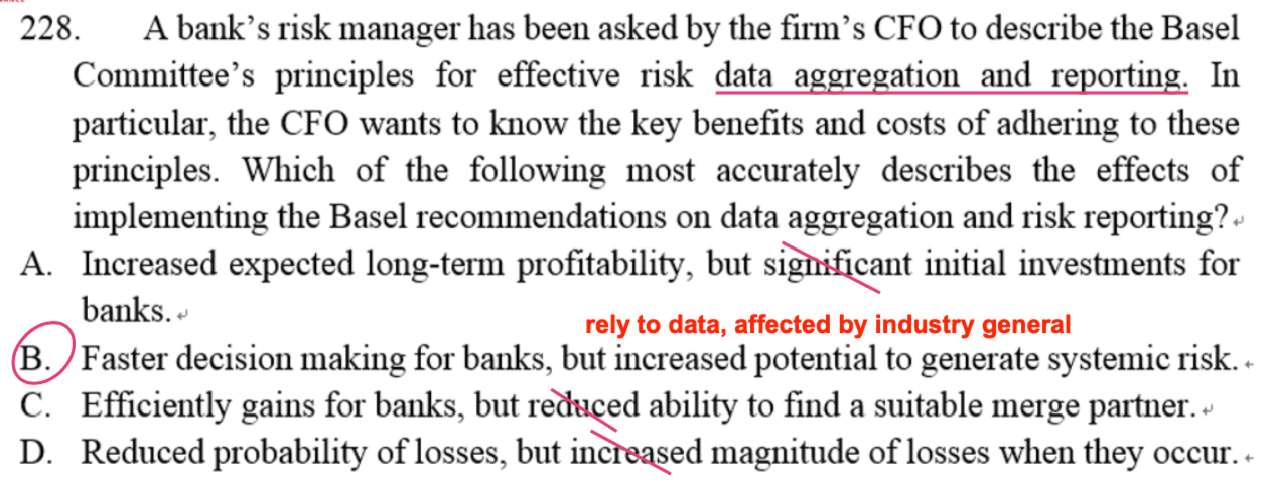 同学你好,这道题应该选A,假想一下,如果巴塞尔协议的推行会增加潜在的系统性风险,那么为什么还要推行,FRM的风控体系一大部分就是巴塞尔协议,所以B选项的说法有点自相矛盾。