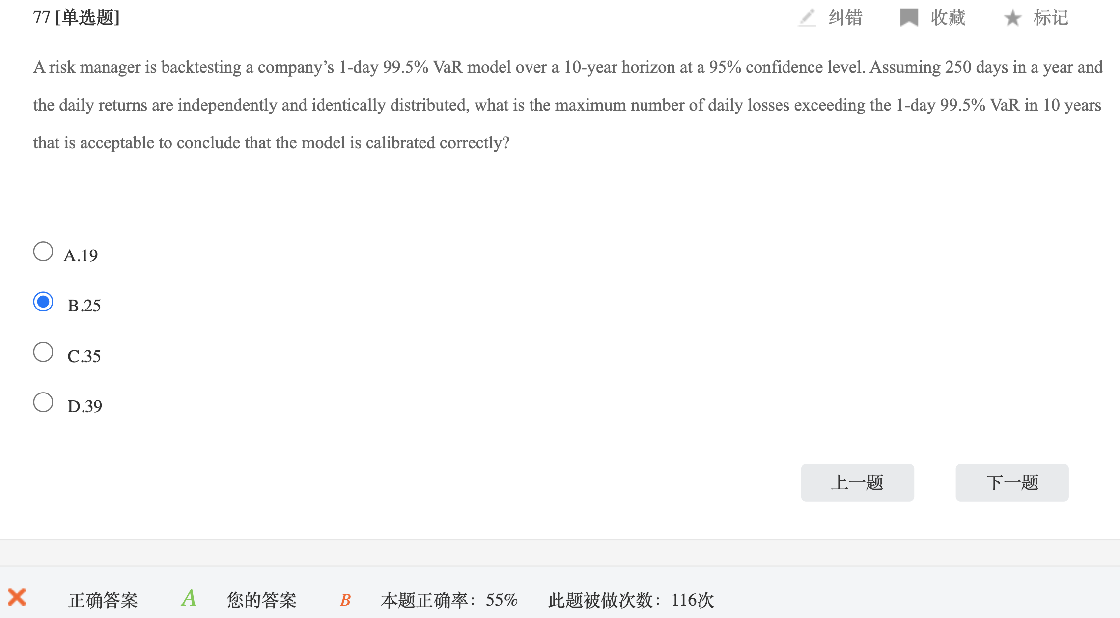 同学,μ=n*p=250*5%=12.5,σ=[n*p*(1-p)]^0.5=[250*5%*(1-5%)]^0.5=3.44,non-rejection为μ±z*σ=[12.5±1.96*3.44]=[5.75,19.25],所以最大的exception为19