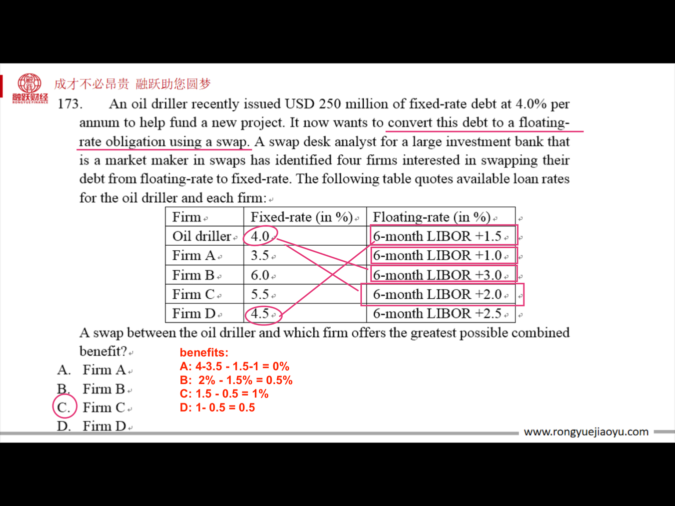 同学你也新年快乐,备考顺利哟!这里是对于绝对优势和相对优势的考察,根据绝对优势和相对优势的比较选出对互换双方有利的借款组合,比如说C公司,相比于oil driller就处于绝对劣势的地位,固定利率比oil driller高1.5%,浮动利率比oil driller高0.5%,相比于比oil driller高1.5%的固定利率,C公司在浮动利率只比oil driller高0.5%,所以C公司在浮动利率借款方面有相对优势,所以C公司与oil driller利率互换的结果是,C公司借浮动,oil driller借固定,成本为4%+LIBOR+2%=LIBOR+6%,如果不互换的话,成本是5.5%+LIBOR+1.5%=LIBOR+7%,combined benefit=(LIBOR+7%)-(LIBOR+6%)=1%