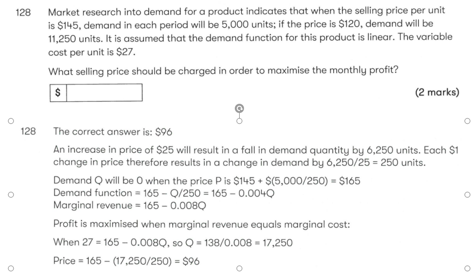 同学,题目考察的知识点是当MR=MC时利润最大化。其中MR=a-2bQ P=a-bQ。根据题目已知条件可以列出方程式145=a-b*5000 120=a-b*11250,解方程式得出a=165 b=0.004。那么MR=165-0.008Q MR=MC时利润最大化,即MR=27时利润最大化。165-0.008Q=27,得出Q=17250,P=165-0.004*17250=96。