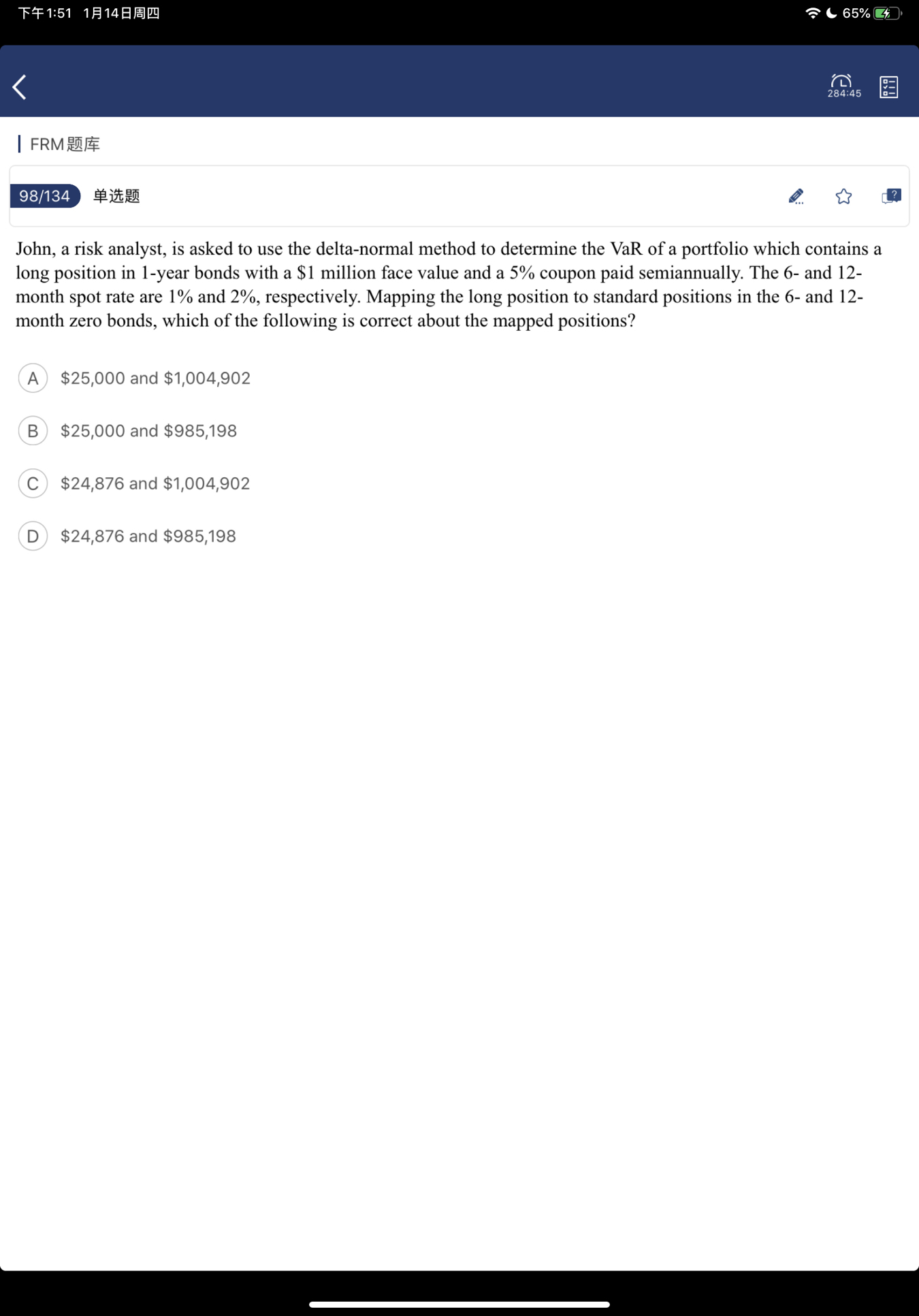 同学,这个题目考察的是VAR Mapping中的cash flow mapping,分别将0.5年和一年时的现金流映射到当前时刻,就可以得到此题的答案;delta normal method在一级第四门科目估值与风险模型中的Calculating and Applying VaR章节,可以去回顾一下