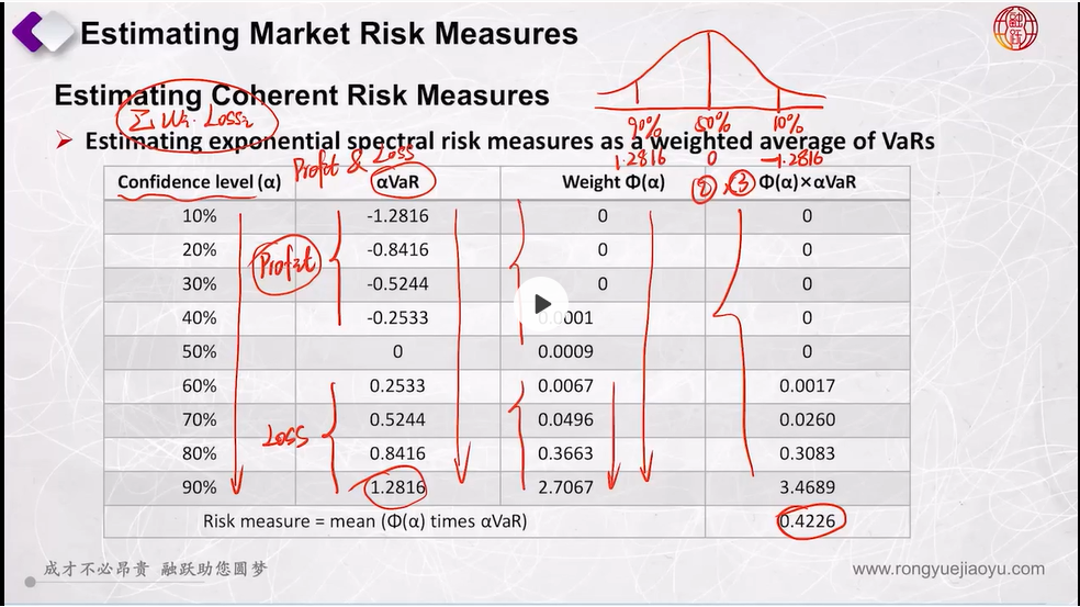 在Estimating Coherent Risk Measures中,通过Exponential Weighting Function计算每一个Confidence Level的权重,损失越大占比权重越大;最后计算并不是最后4个数字的平均,是最后一列的加权平均,只不过前5个都为0,