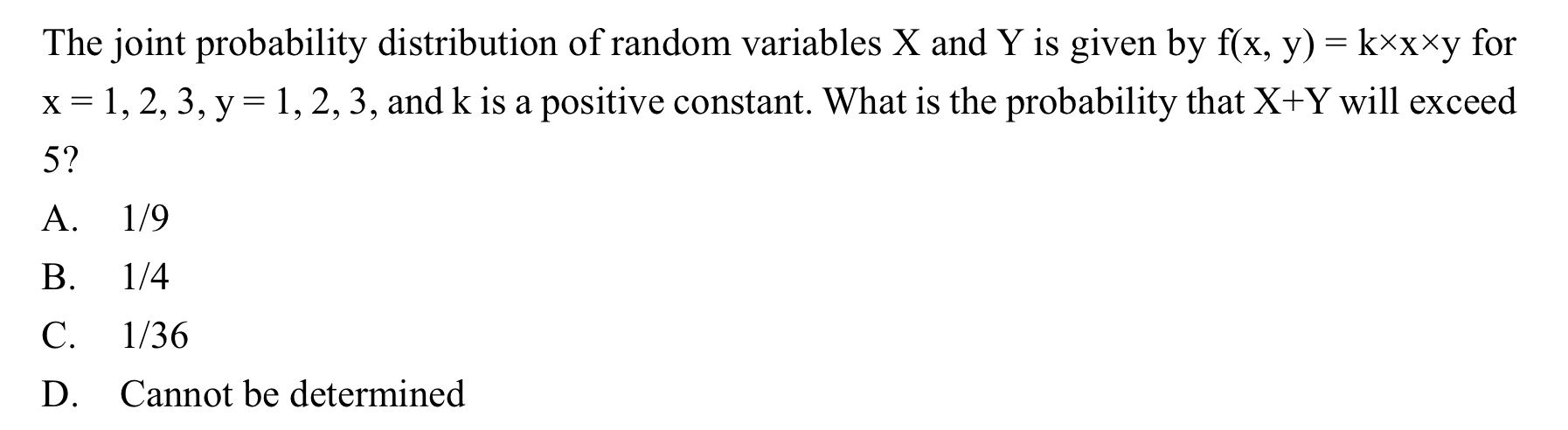 同学你好,首先,这道题要求的是X+Y>5在联合概率密度函数中函数f(X,Y)=k*X*Y中的概率,计算概率首先要知道该函数的无条件概率即分母是多少,根据答案中的概率矩阵可知,有九种可能性之和应该为1,即36k等于1,则k=1/36,而当X=3,Y=3时,f(x,y)=9k,全概率为36k,此时所求概率即为9k/36k=1/4.