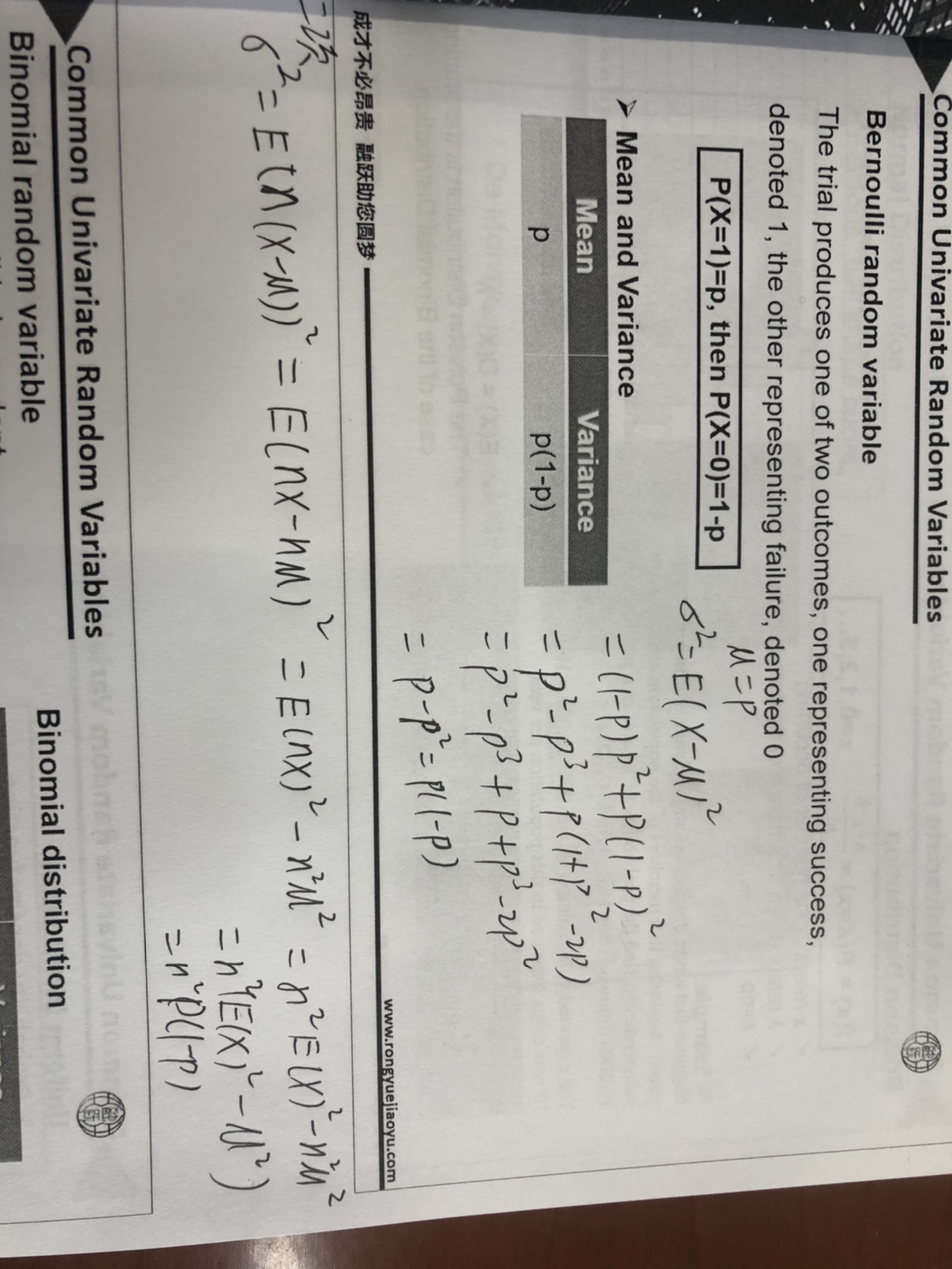 下边的公式更容易理解: 对于二项分布X~B(n,p),每一次伯努利试验都相互独立,因此: E(X)=E(X1)+E(X2)+...+E(Xi)+...+E(Xn)=p+p+...+p+...p=np D(X)=D(X1)+D(X2)+...+D(Xi)+...+D(Xn)=p(1-p)+p(1-p)+...+p(1-p)+...+p(1-p)=np(1-p)