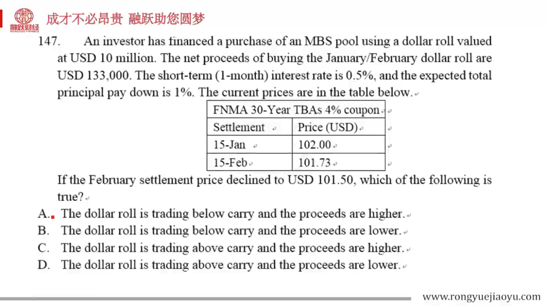 D选项没有错,这个题是让计算二月价格下降到101.5元时的net proceeds,计算完之后即然要比较大小,肯定是要做差的,1月的价格是102卖出,二月要买,所以价格小于102越多proceed越高,那么也就是说题干中给的net proceeds 133000就更小