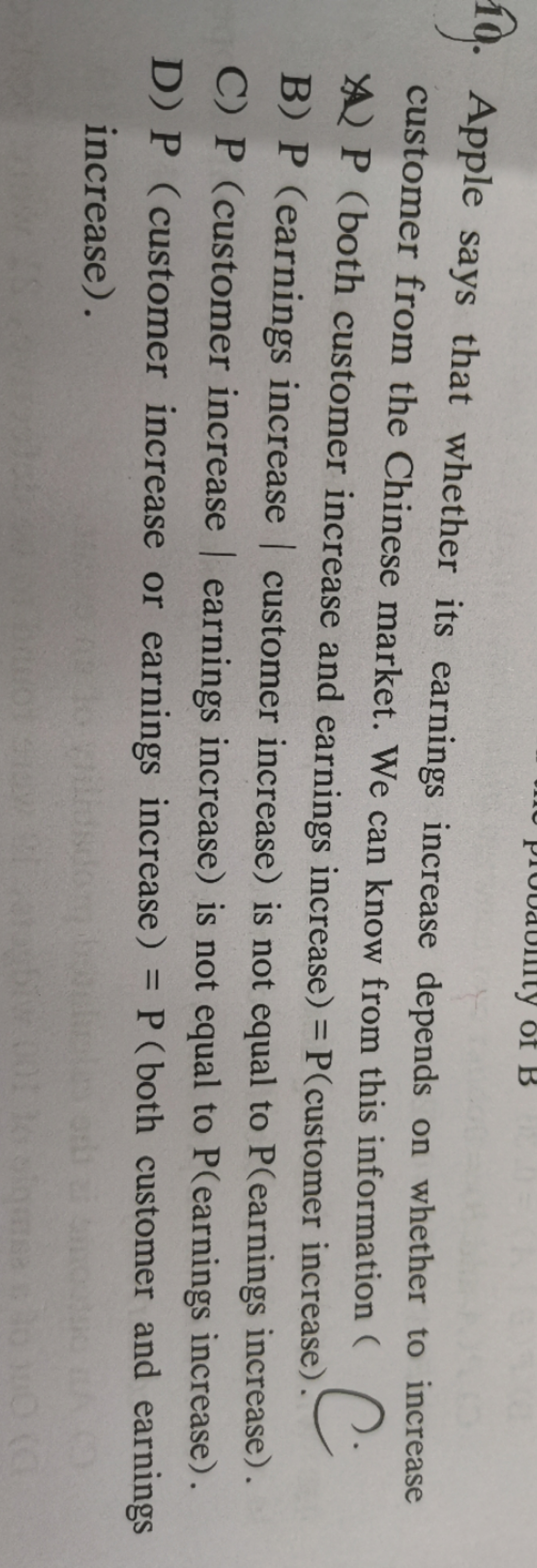 答案应该选择C,结合题干,题干中说的是收益的增长取决于消费者的增长,消费者的增长一定会引起收益增长,但反过来就错了,C选项是说收益增长情况下是客户增长的概率,这个是不确定的,因为消费者增长引起收益增长,但收益增长并不一定全由客户增长引起,所以收益增长情况下是消费者增长的概率不等于收益增长的概率