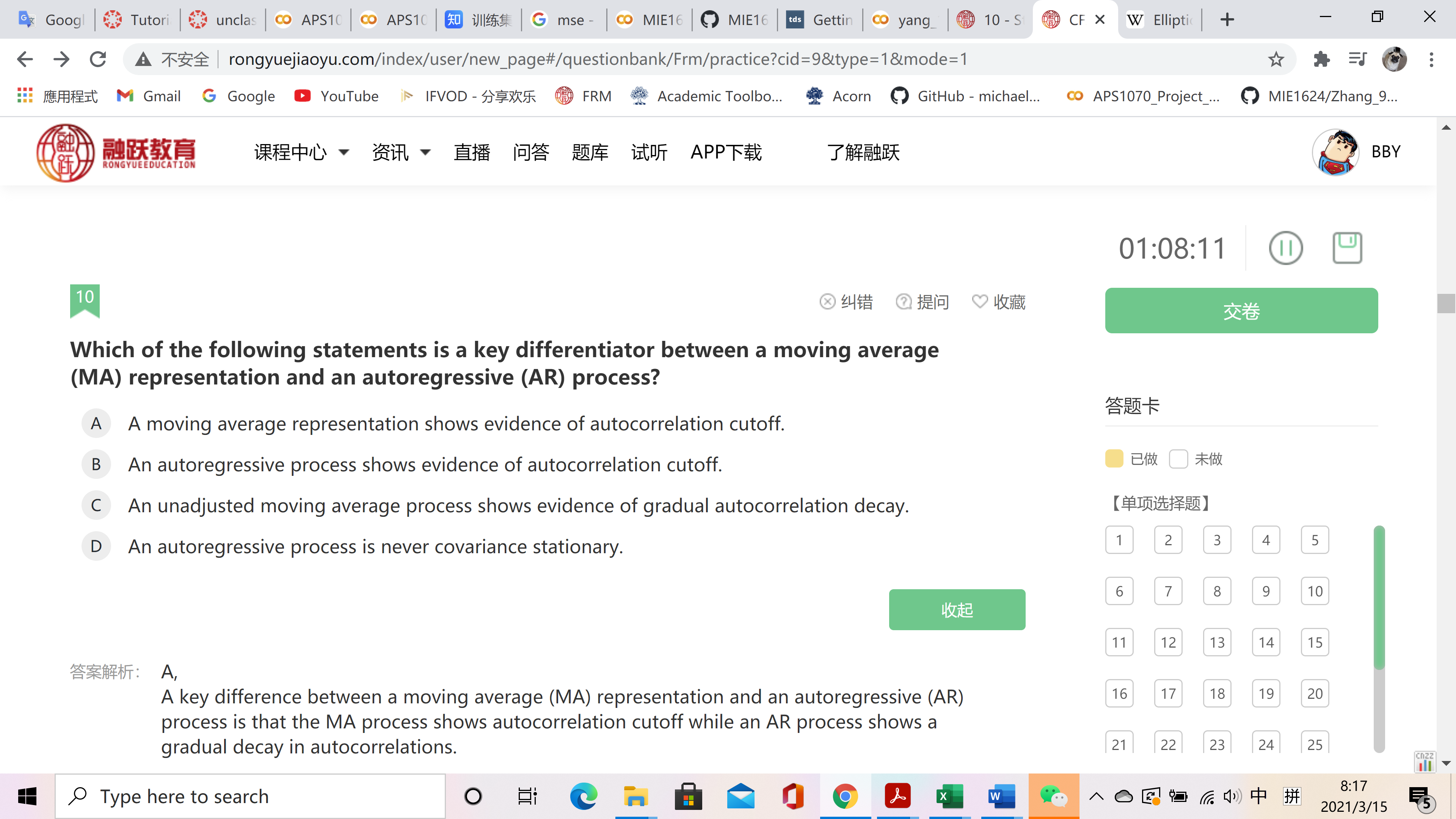 这个题你可以在回顾一下讲义中讲的这两个模型的区别,MA模型的autocorrelation应该是cutoff,而AR模型的autocorrelation应该是delay,AR模型是有可能协方差平稳的,在fai值小于1的时候