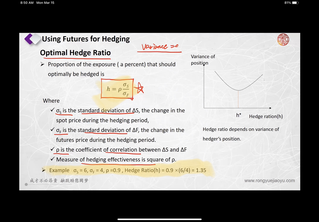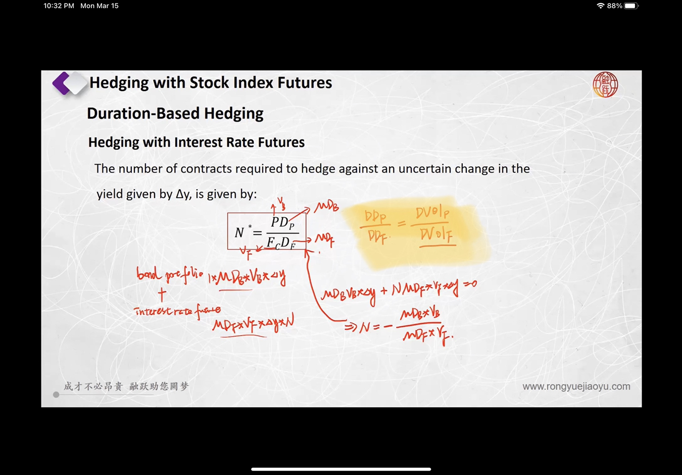 现货的总价值*现货的修正久期*delta(y)=每份期货合约的价值*合约份数*期货修正久期*delta(y),只有这个公式成立,才能保证两个市场的波动一直,规避风险,所以可求出期货合约的分数=(现货的总价值*现货的修正久期)/(每份期货合约的价值*合约份数*期货修正久期)