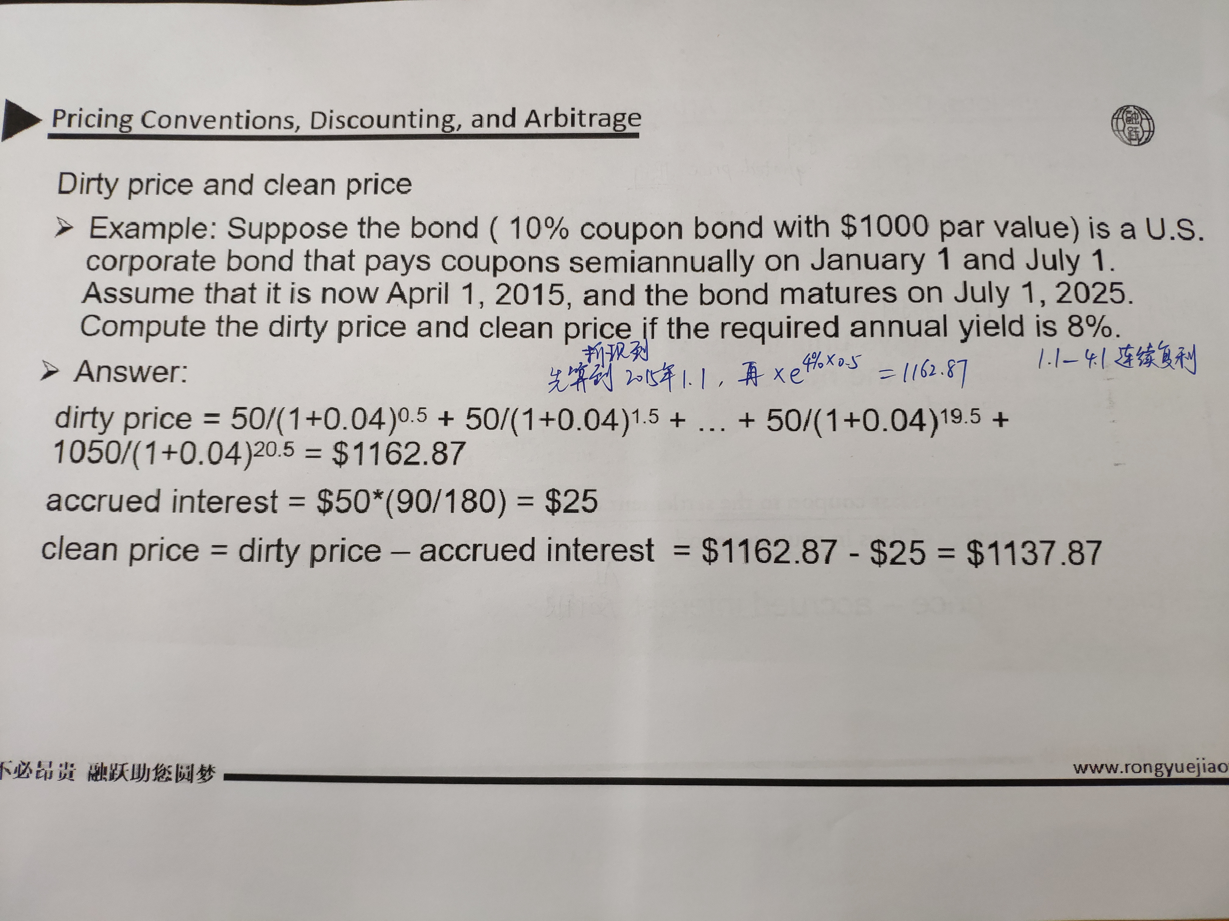 这个地方的准确的算法是折现到2015年1月1号之后,算出1140.29,然后用1140.29*(1+4%)^0.5=1162.87,老师的那种连续复利的算法是为了简便,结果上有些许偏差,而你的那种算法是按照单利计算的,是错误的!