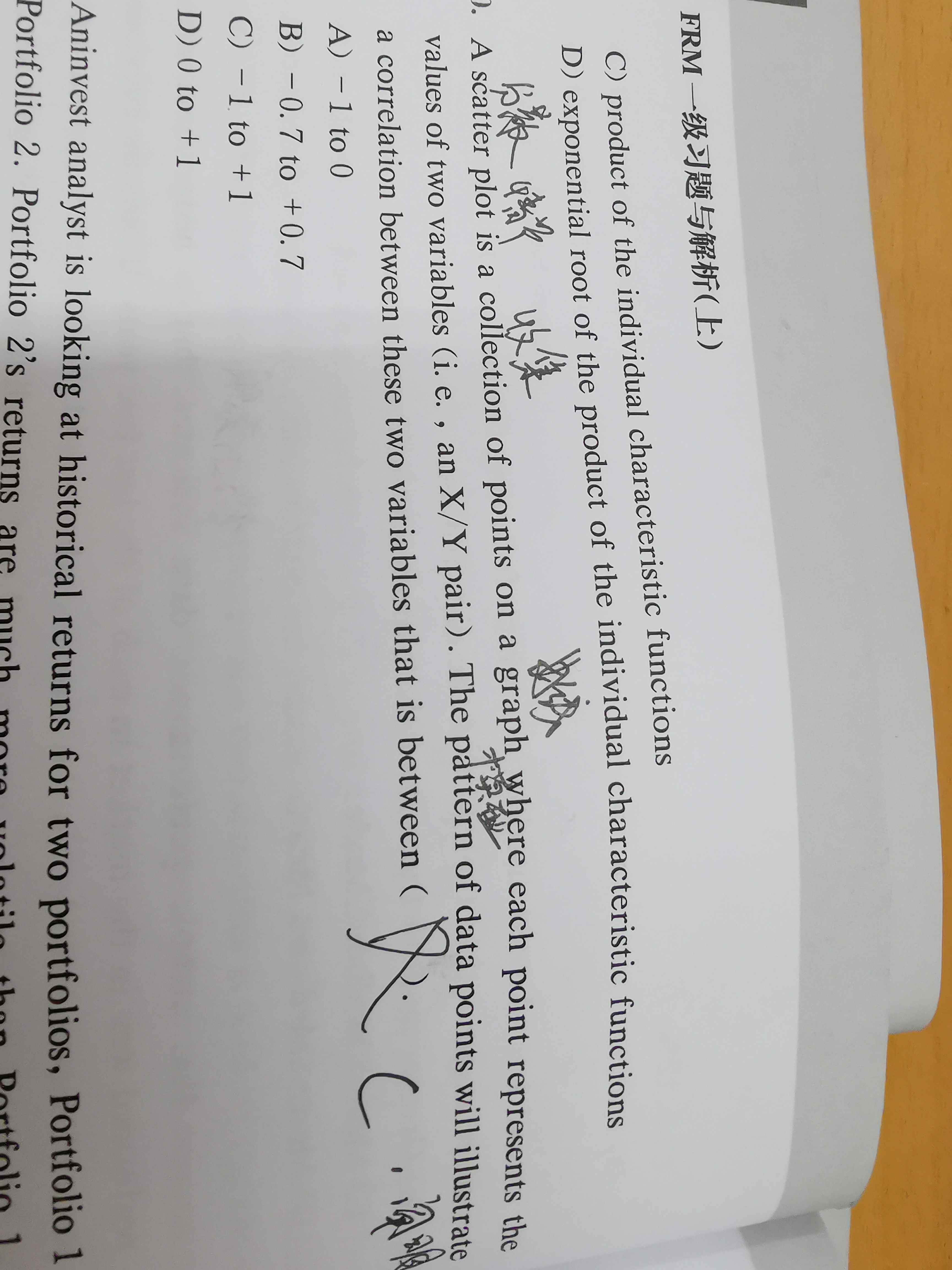 同学,题目意思是说两个变量之间的相关性关系可以用散点图表示出来,也就是(X,Y)点用图像的形式表示出来,题干中问这个图形的斜率就是X和Y的相关性,相关性取值在-1和1之间