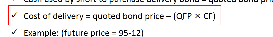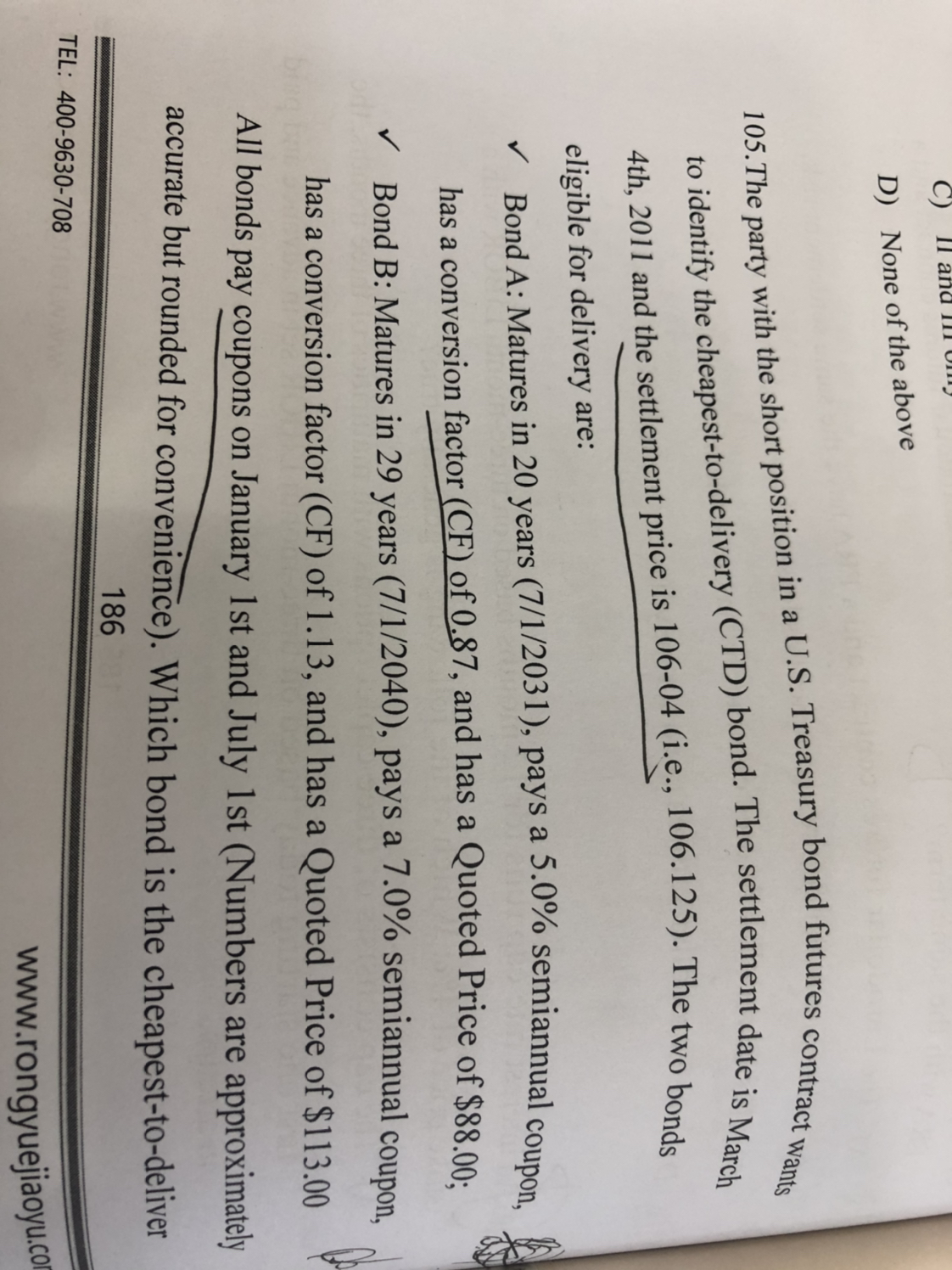 空头头寸债券的收入 - 购买债券的成本 =(结算价格* 转化因子CF + AI) - (报价债券价格+ AI)=结算价格* 转化因子CF-报价债券价格,债券A:0.87*106.125-88=4.3286;债券B:1.13*106.125-113=6.92125;
