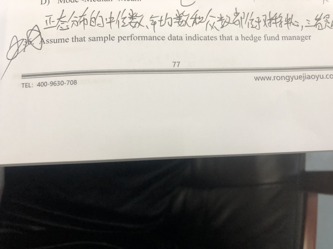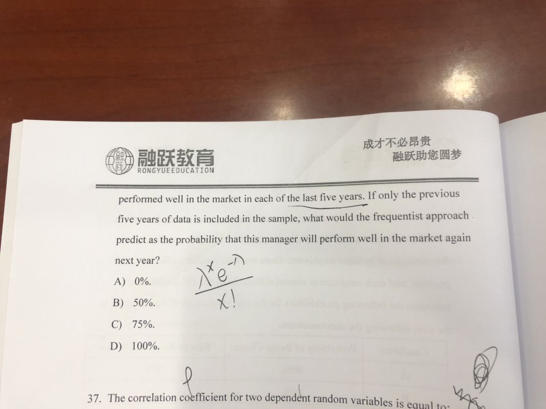 同学你好,这道题的意思是说过去一个对冲经理过去每一个五年的表现都非常好,如果抽取上一个5年的数据作为样本对下一年的表现进行预测,那么下一年的表现比较好的概率是多少,根据频率法计算概率,就是频数/样本量,过去五年都表现比较好,也就是每年表现好的概率为5/5=100%,所以推出下一年表现好的概率也是100%。