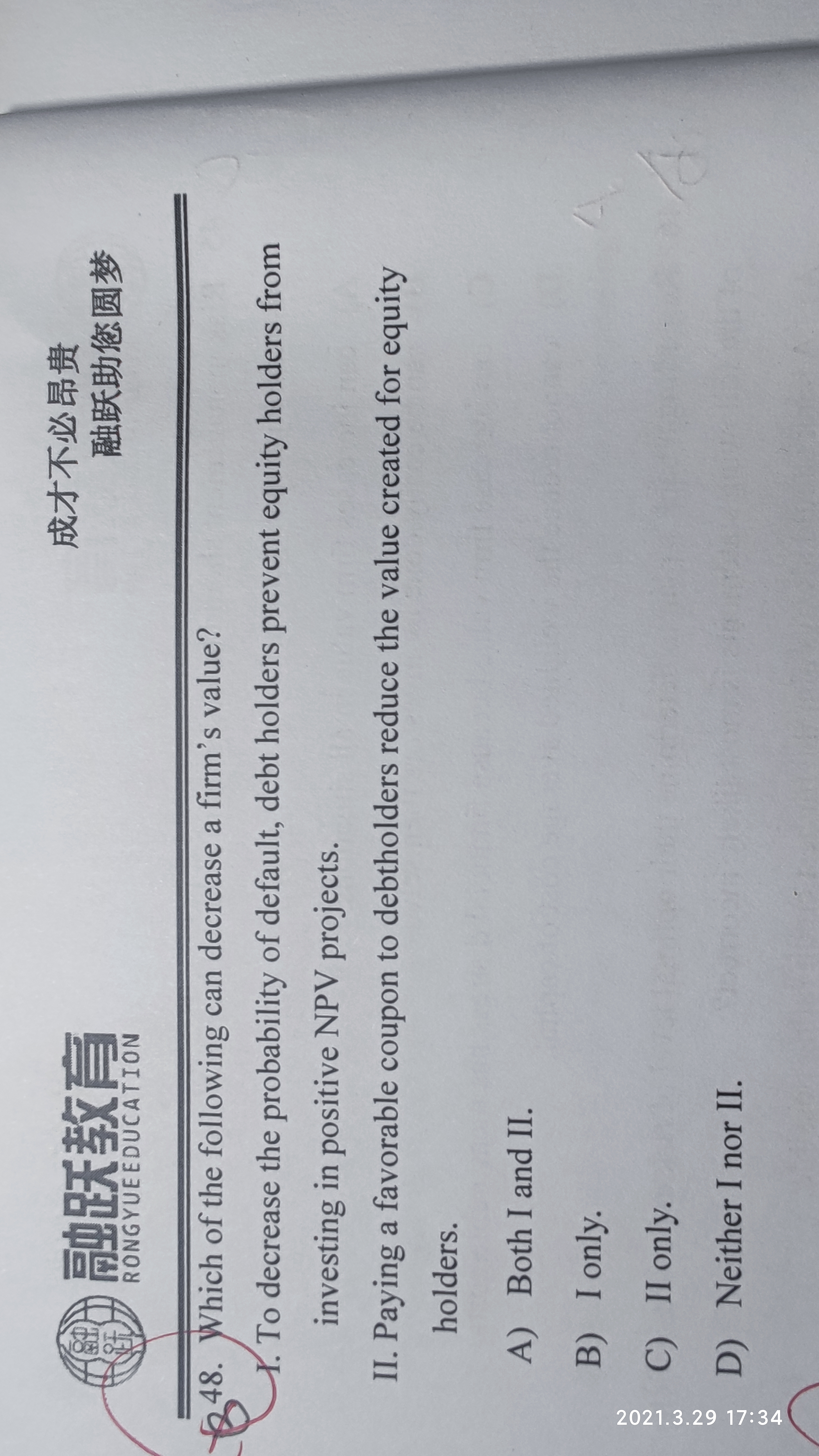 同学你好,这道题第一个说法的意思是说债权人为了降低公司的违约概率,阻止股东去投资具有正NPV的项目,正NPV虽然会带来预期现金流但是同时也具有风险,但是公司要发现要盈利,就不能因噎废食,所以第一说法长期来说会降低公司的价值。 第二个说法的意思是说把有股东创造的利率以更高的票息分给债权人,这个也会降低公司equity的价值,所以也不对,同学谨记一点,公司的价值主要体现在equity上。