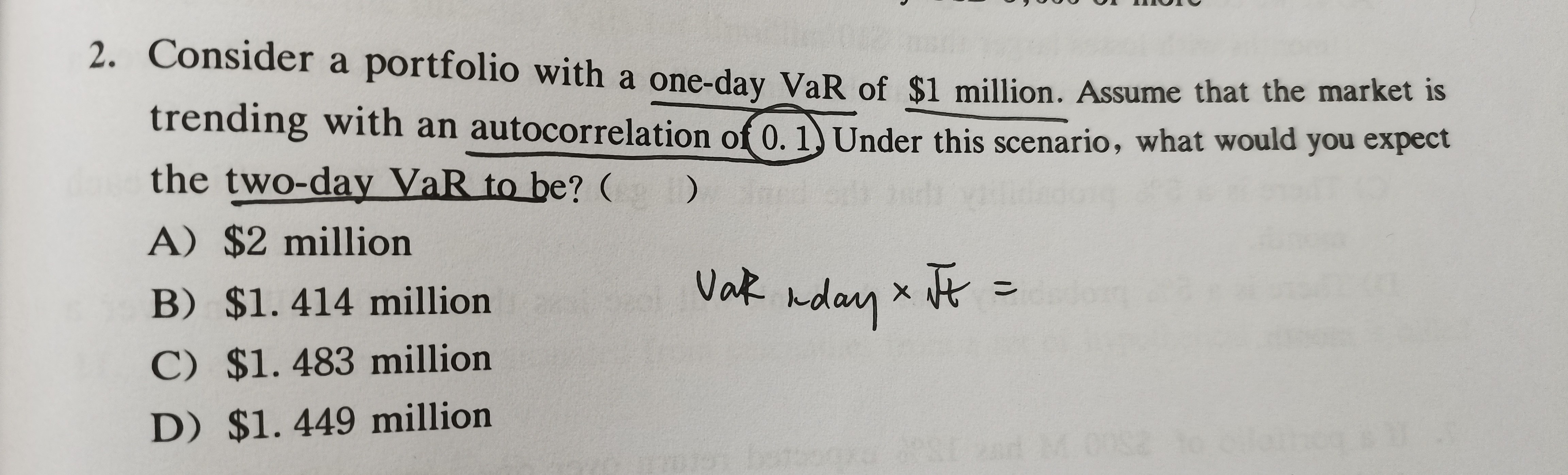 同学你好,第一道题的计算过程参考图片1,第二道考察的是假设资产每天的价格不是相互独立时VaR的计算,因为不独立,所以不能直接用平方根法则,具体解法参考图片2理解。