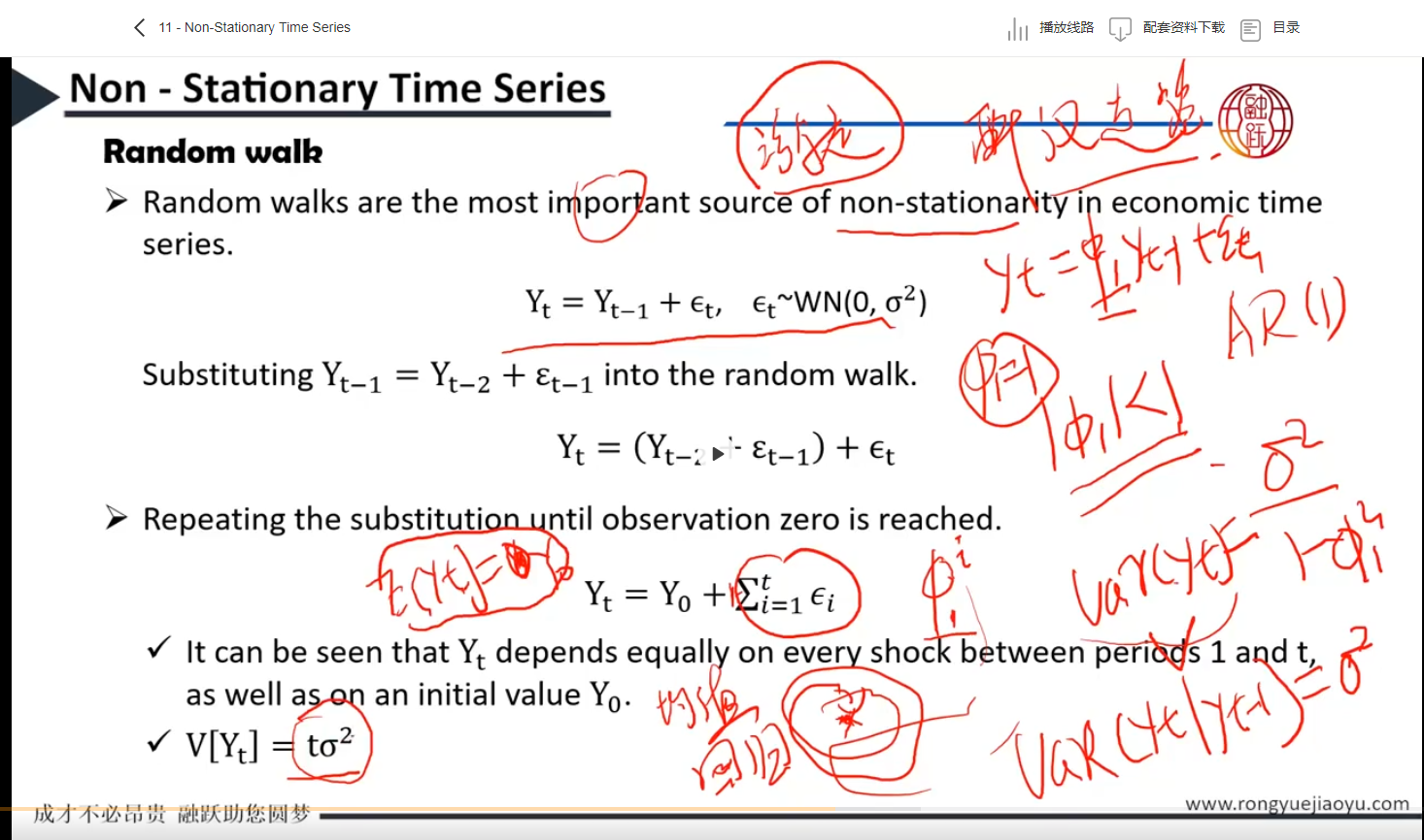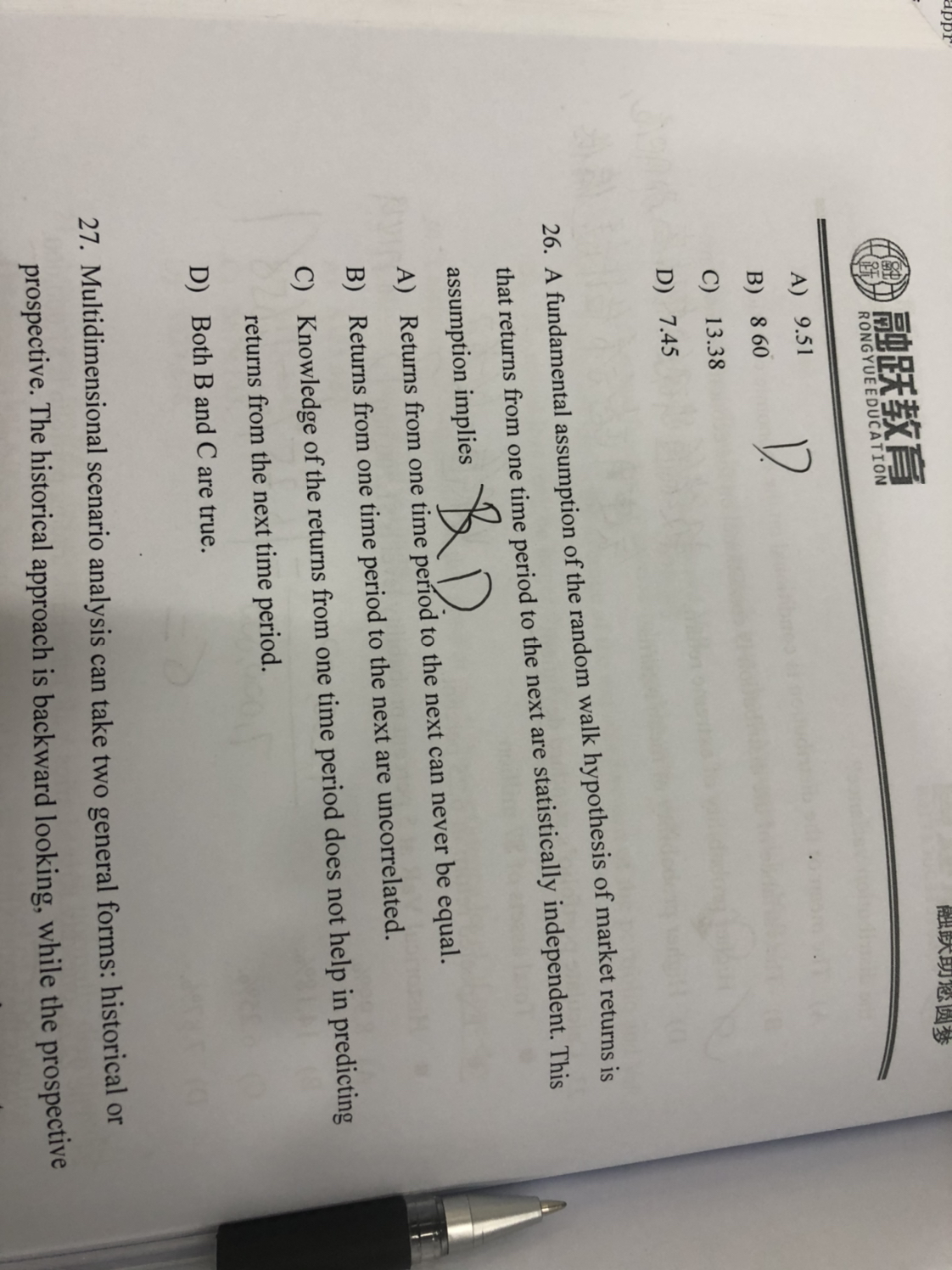 这道题讲的是随机游走,两天的收益率相互独立,也就是说上一天收益率对于预测下一天的收益率没有实际帮助。具体位置参考图片