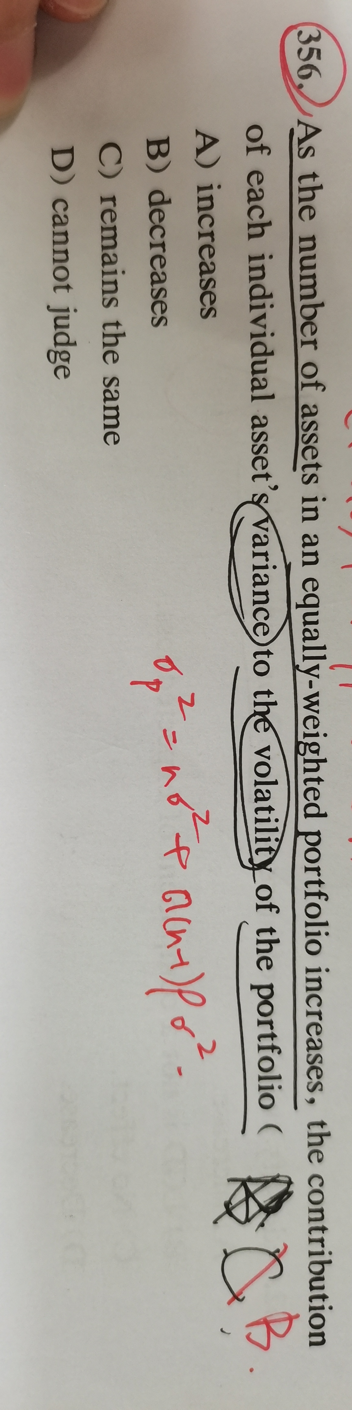 同学你好,这个公式里面的标准差是单个资产的标准差,因为组合中的每个资产都是等权重(指的是单个资产的价值比上组合的总价值)的,所以随着资产数量的增加,加上组合风险分散化的效果,每个资产的风险(体现为方差)组合贡献比会逐渐下降。