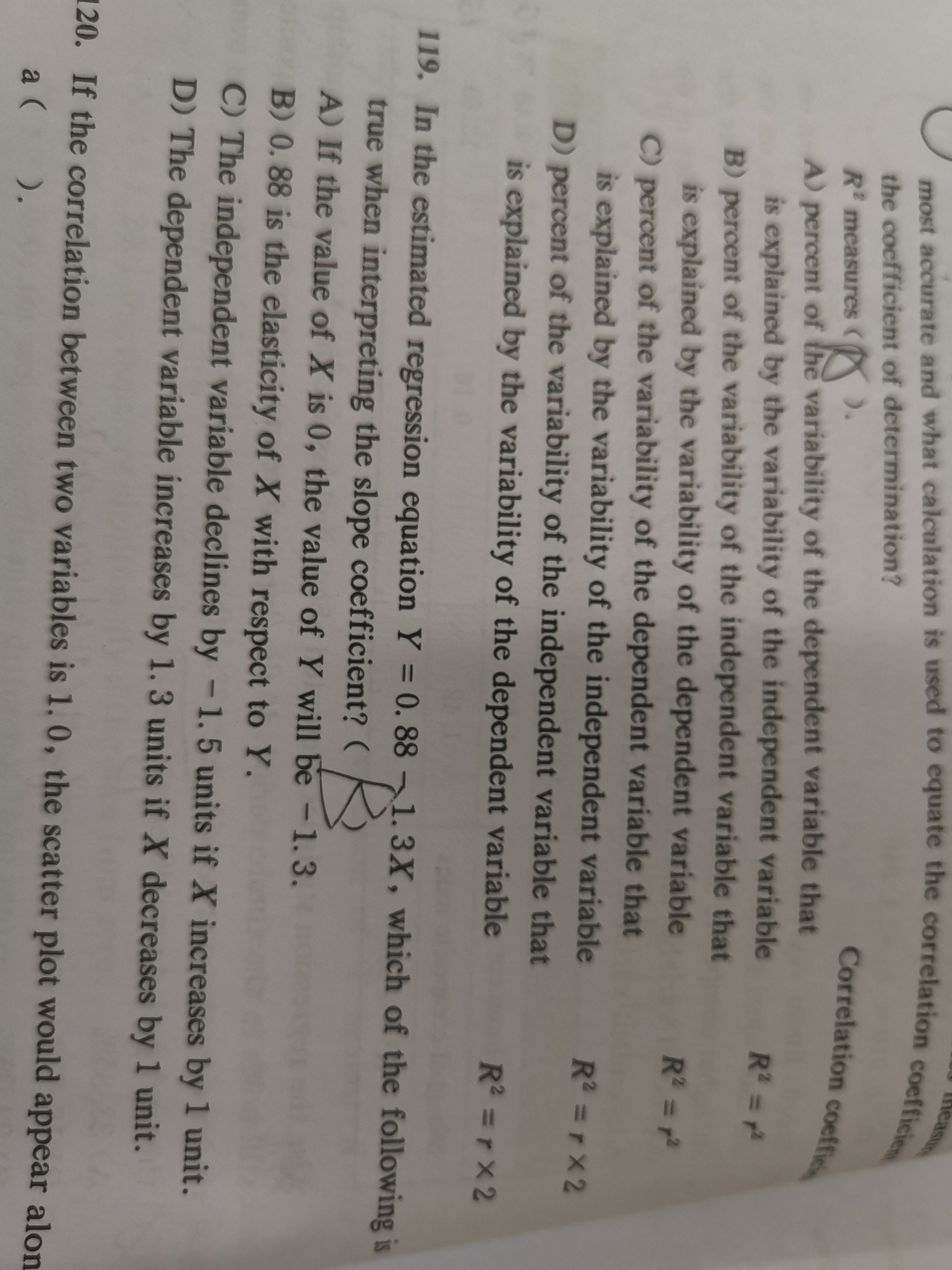 同学你好,D选项没错哈,说的就是当自变量X降低一个单位,因变量Y上升1.3个单位,斜率为-1.3,方向相反。B选项的意思是0.88斜率代表弹性,也可以理解为敏感性,B选项错在X和Y写反了。