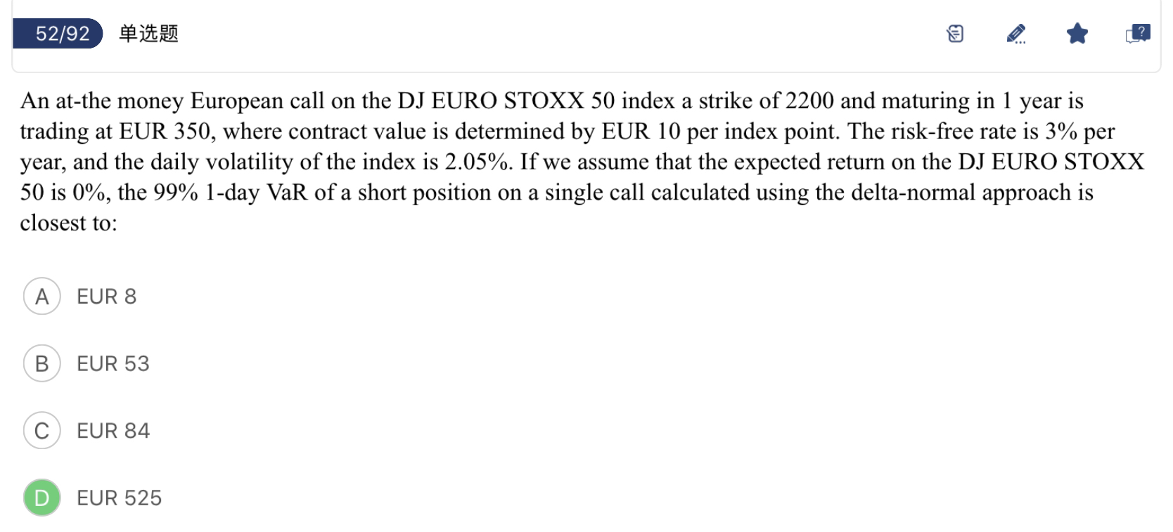 同学你好,建议直接用delta-normal法计算,VaR(一天99%call)=D*VaR(Index)=0.5*(10*2200*2.33*2.05%)2200*10就是标的资产的价值,乘以delta0.5,套入公式即可