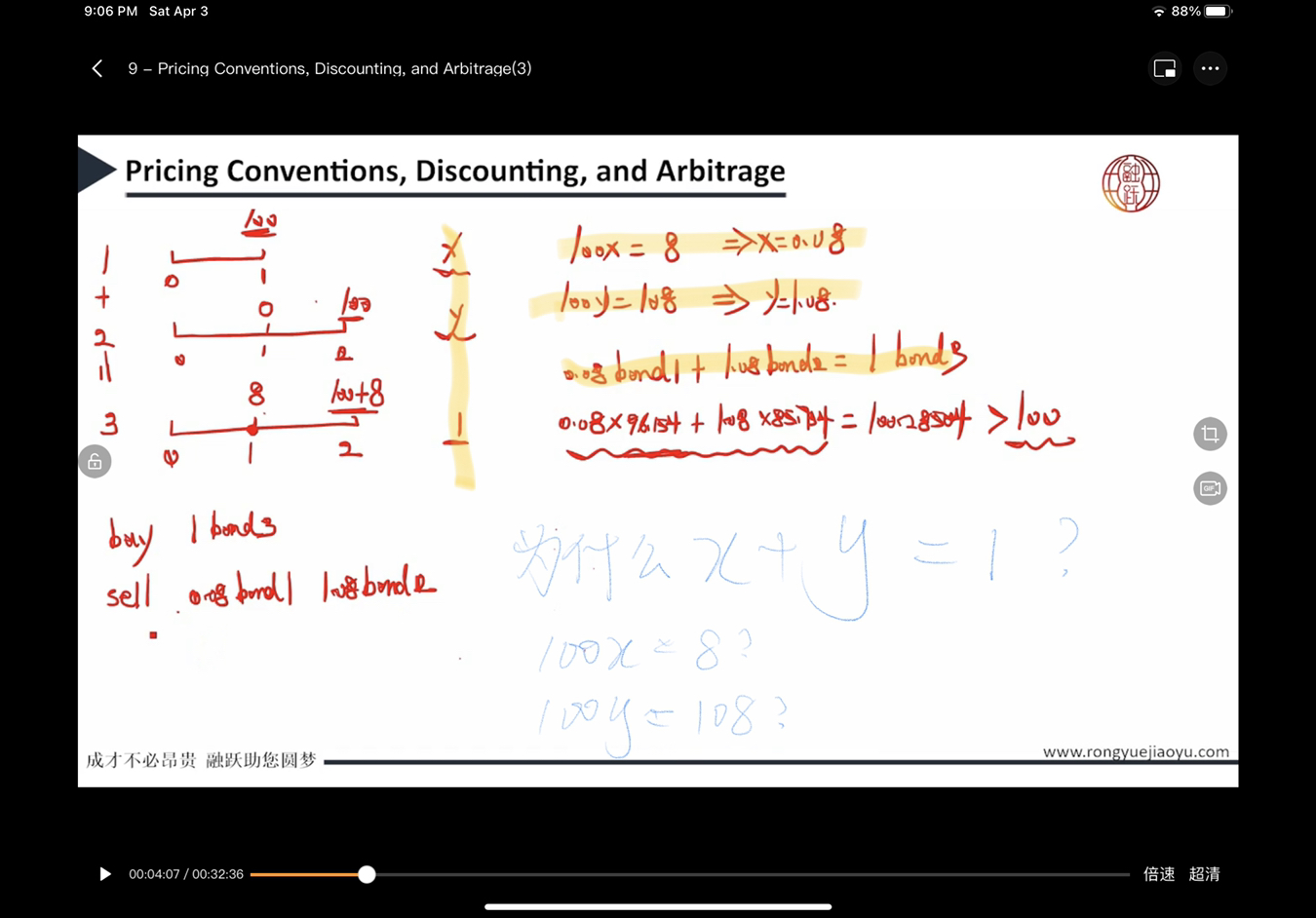 同学,XY是为了构建目标现金流而赋予两个基准债券的权重,相加应该等于1;100X=8和100Y=108是对于1时刻和2时刻的现金流的计算