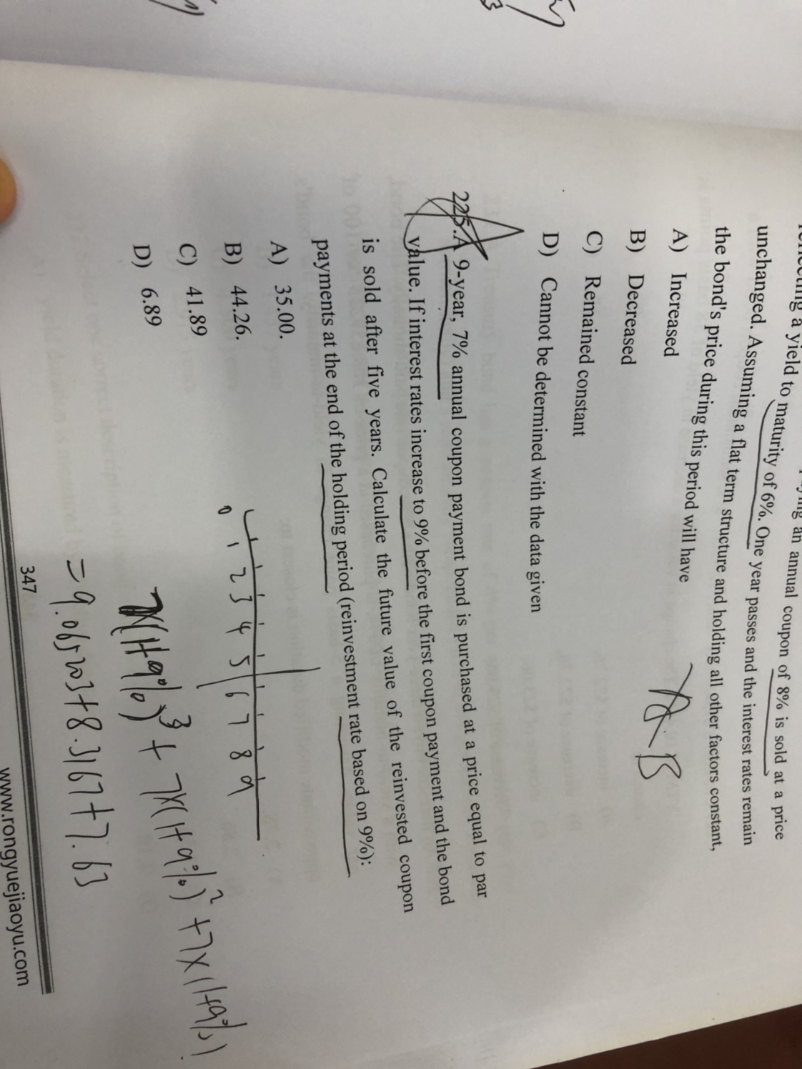 同学,这个题目表述的好像很复杂,但实际考察的内容非常简单,就是让我们用9%的折现率求一下coupon为7的债券的终值,使用金融计算器,PV=0、N=5、I/Y=9、PMT=7,计算出终值等于41.89