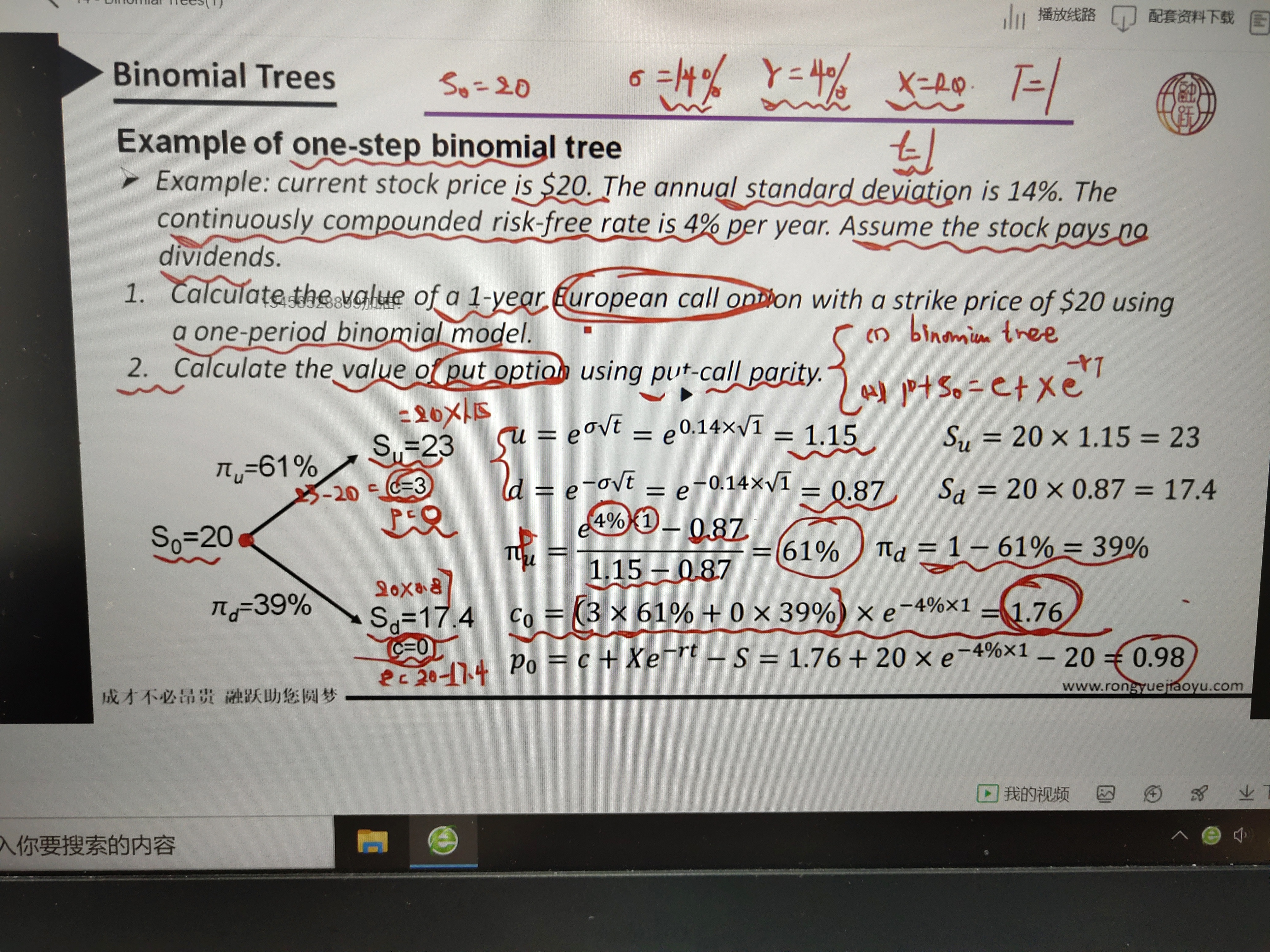 对于第二问 我们有2中算法去计算 这是视频中的原话 在二叉树模型第46分48秒的时候 你去看看吧 第一种算法也就是用二叉树算出来答案有偏差 视频中只让我们自己算 但直接给了第二种算法的答案