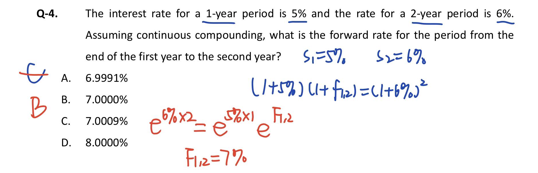 同学你好,蓝色的方法是用于一般复利情况下使用,红色的方法是用于连续复利情况下使用,而这道题题干中就是要求连续复利,所以用红色的方法。
