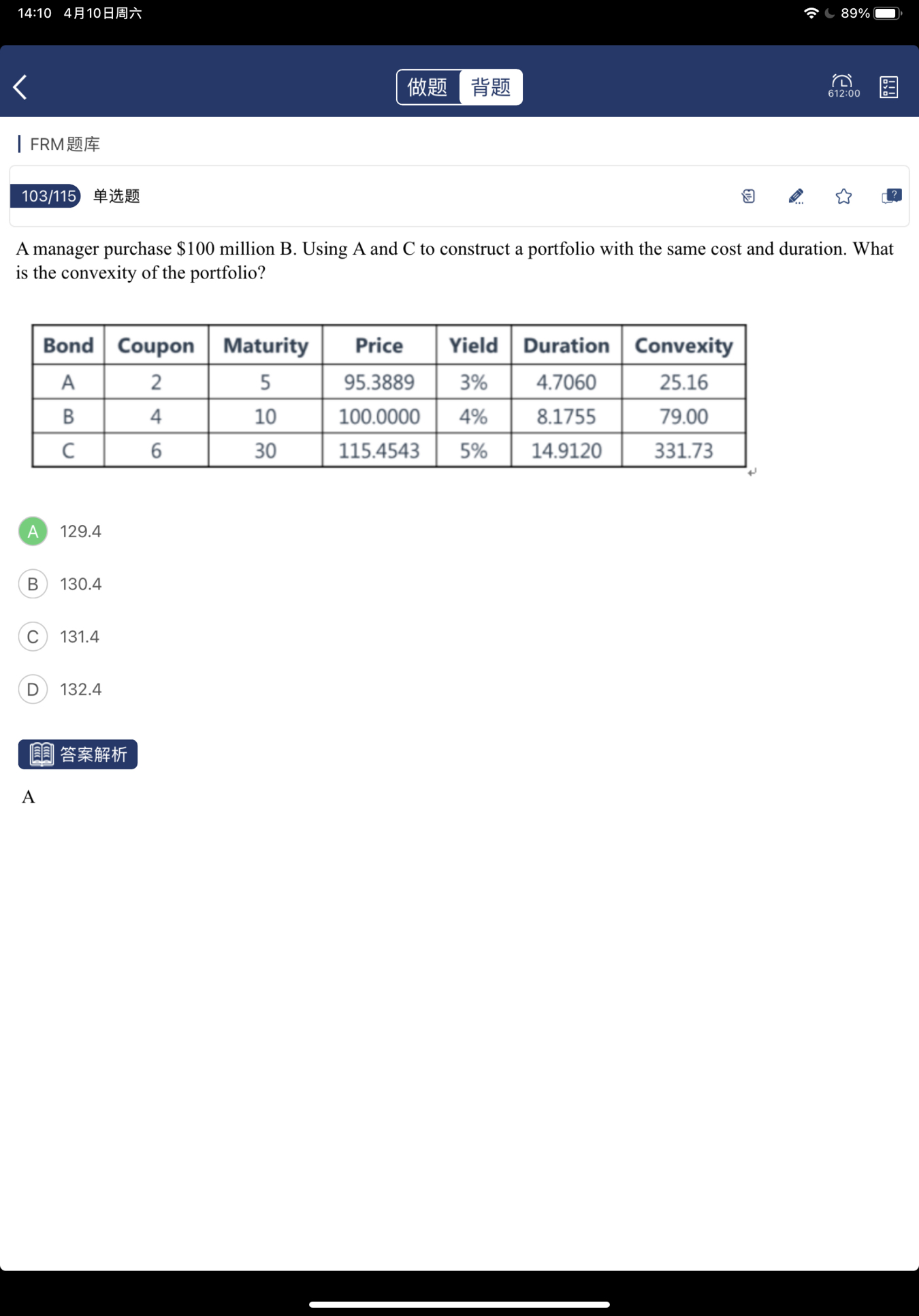 同学,计算过程如下哈,假设债券A的weight为X,则要满足A和C组合的Duration与B相同,有以下公式: 4.7060X+14.9120(1-X)=8.1755;求得,X=66%; 则the convexity of portfolio=66%×25.16+34%×331.73=16.61+112.79=129.40。