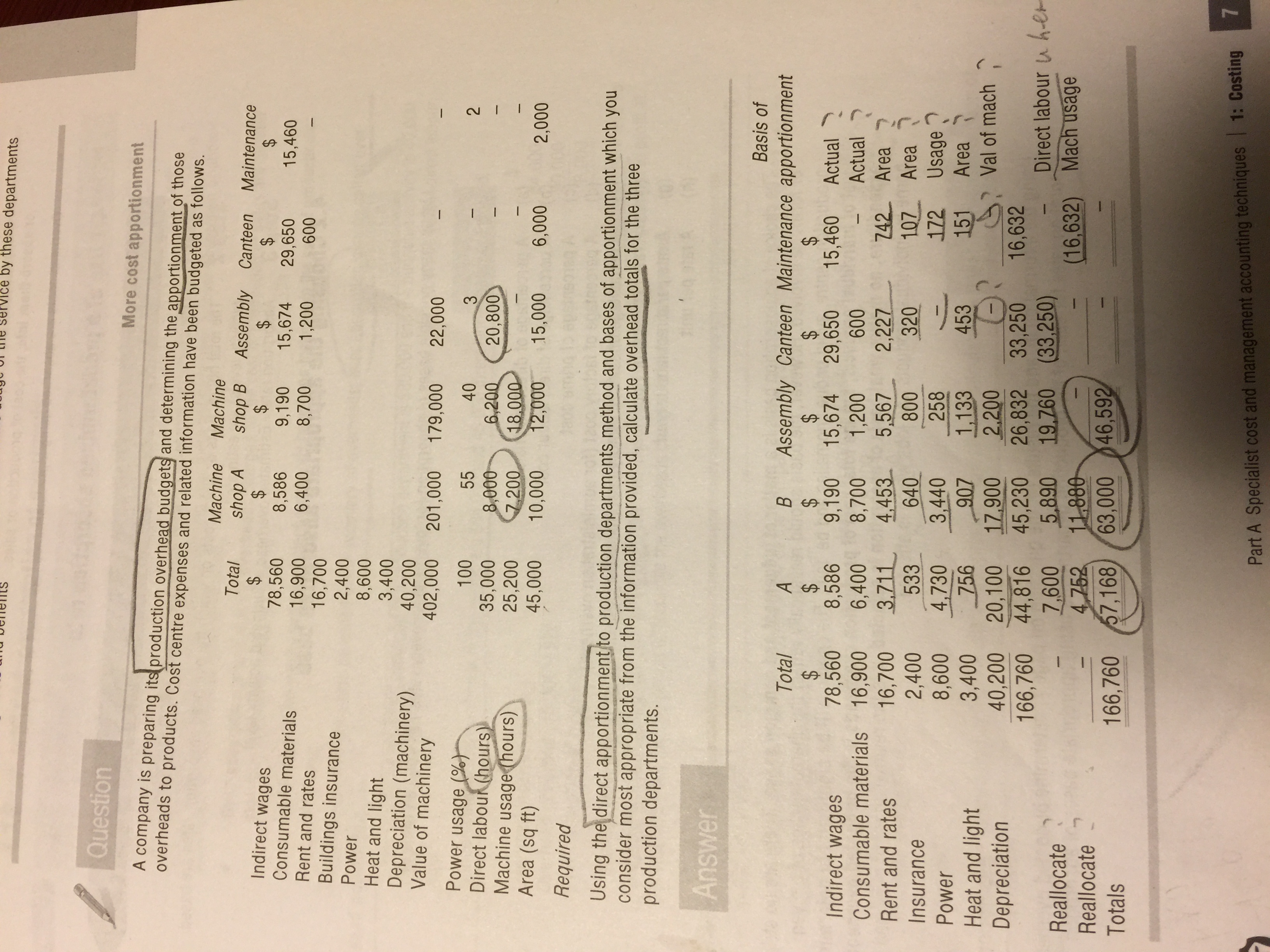 同学,讲解3711,其他同理,首先判断租金很可能跟租房面积相关,按照area来进行分摊,A=16700*10000/45000=3711。计算完其他后再将canteen的33250按照labour来再分配,A=33250*8000/35000=7600,其他同理,再将maintenance的16632按照mach usage来再分配,A=16632*7200/25200=4752。最终加总。
