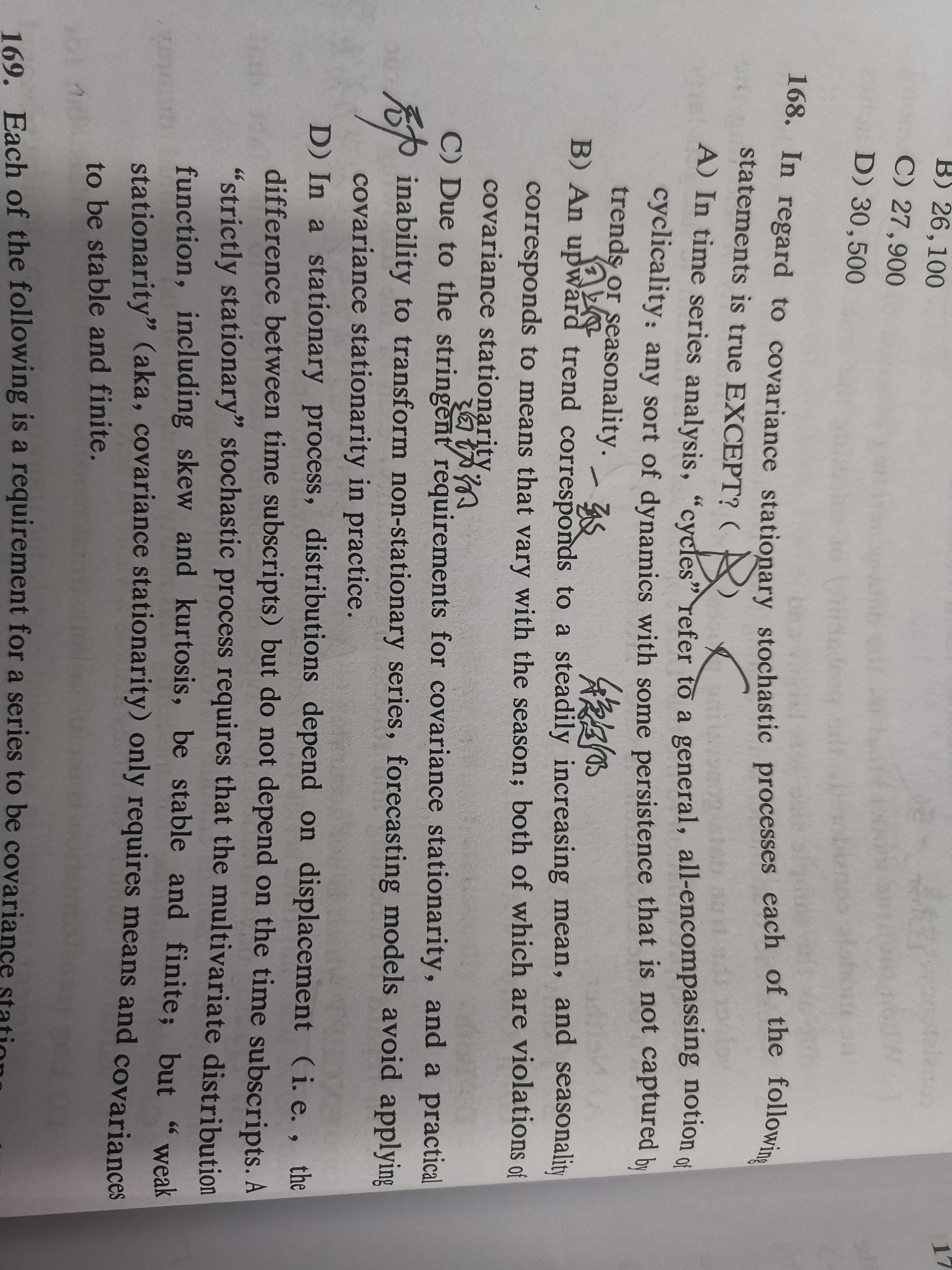 同学,B选项意思是上升趋势对应于一个稳定增长的平均数,而季节性则对应于随季节变化的平均数;这两者都违反了协方差平稳性,是正确的哈