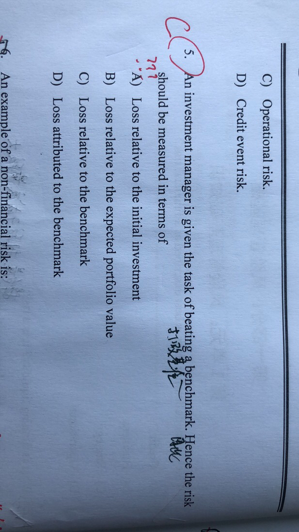 同学,题干意思是基金经理想要超过基准,他需要基于什么来测量风险 ,正确答案应该是C选项哈,基于相对于基准的损失来度量哈