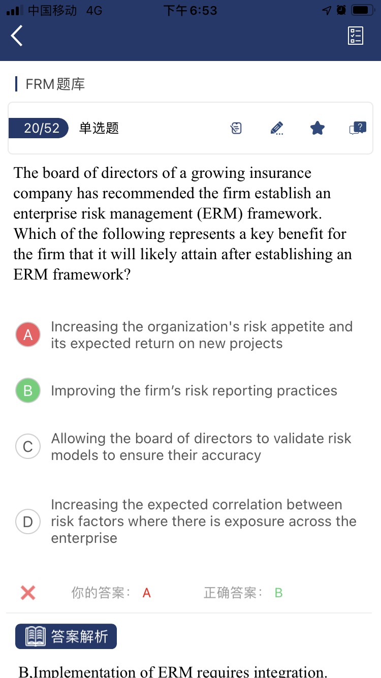 同学,实施企业风险管理需要整合。建立一个集中的风险管理部门,在业务流程中注入全面的风险管理方法,并采用协调的风险转移战略,可提高银行各种做法的效率和业绩,包括风险报告。所以B选项是正确的,A选项意思是提高组织的风险偏好和对新项目的预期回报,不是实施全面企业风险管理的好处哈