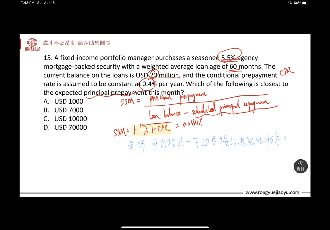 同学,I/Y是不需要加百分号的哈,比如说I/Y是5,直接按5按I/Y就可以了;图二中算出SMM后,根据CPR=1-(1-SMM)^12就可以算出CPR了