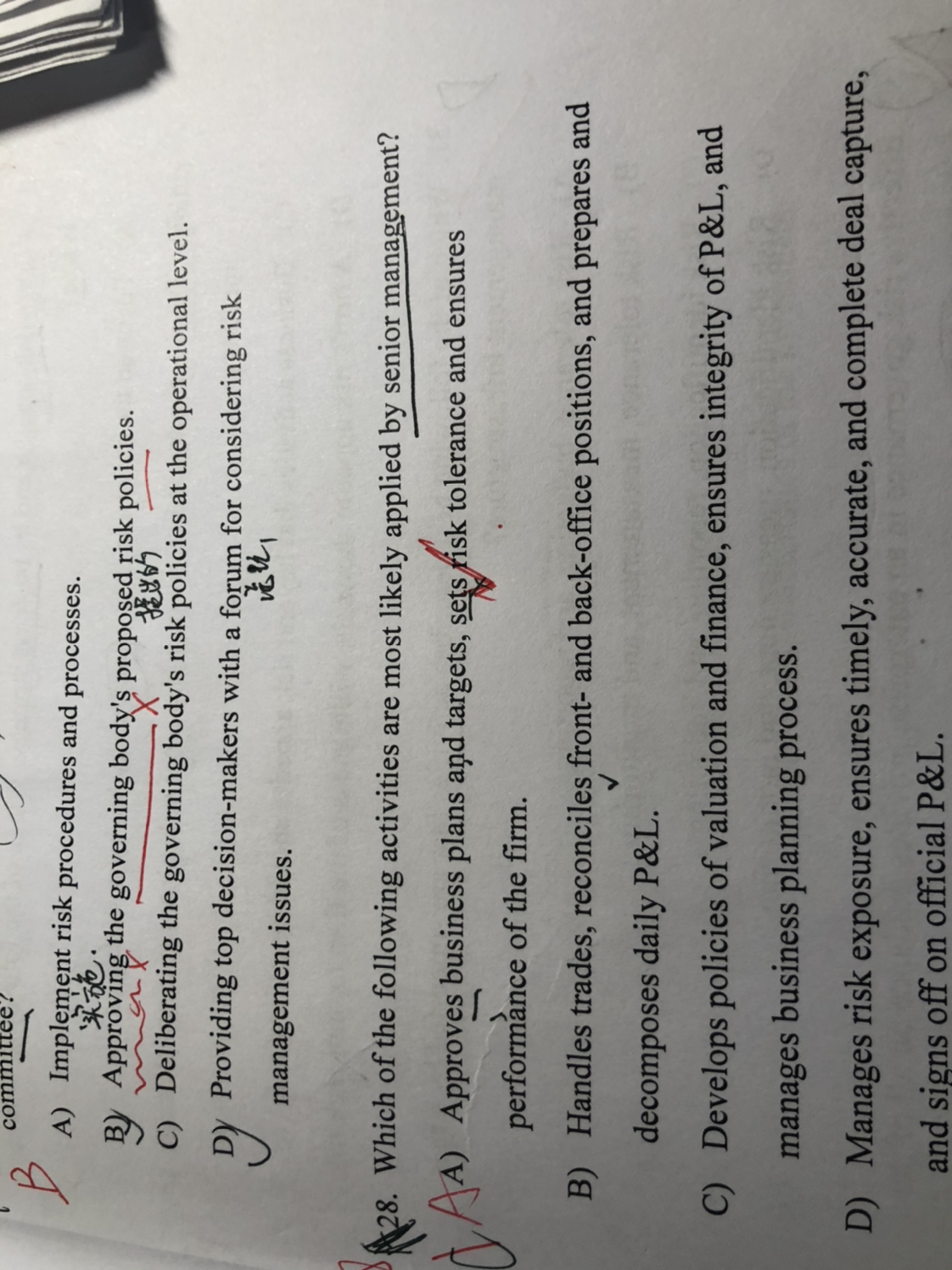 同学你好,董事会的职责是设定公司风险偏好,高管决定每年市场风险承受能力。一个负责总目标,一个负责具体的目标细分。