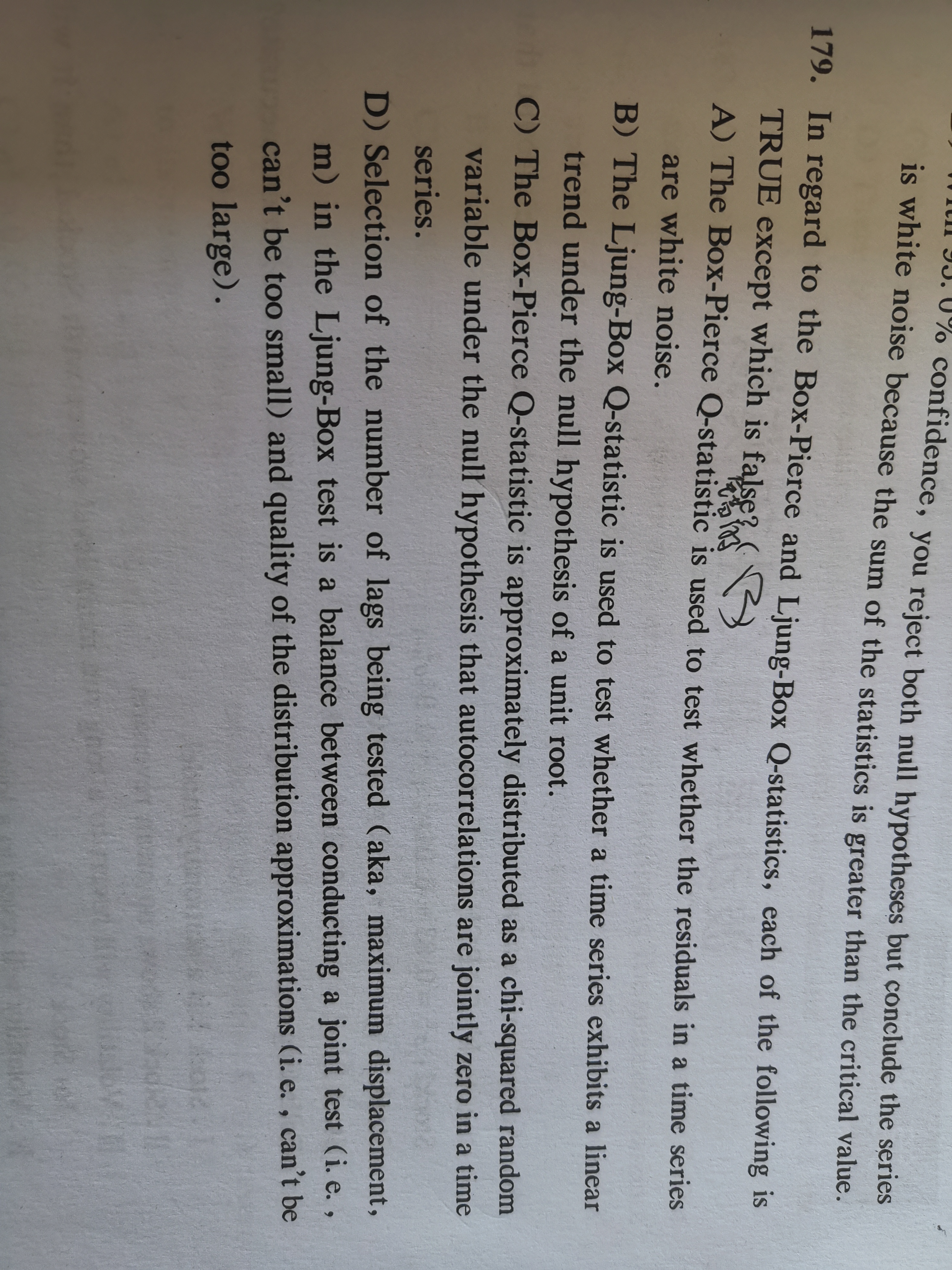 同学你好,这道题考察的是关于白噪音的检验,使用的是BPQ统计量,该统计量服从卡方分布,所以C对; 原假设是:该时间序列是存在白噪音(即任意阶数的自相关系数ACF都同时等于0),所以A对;但我们显然不可能检验所有滞后阶数的 ACF是否都同时为0,只能选取m阶进行判断,这个m不能太大也不能太小,可以证明应该选择在根号T附近,所以D对。 B选项说的是单位根检验,主要用于时间序列是否平稳性进行检验,跟本题无关。