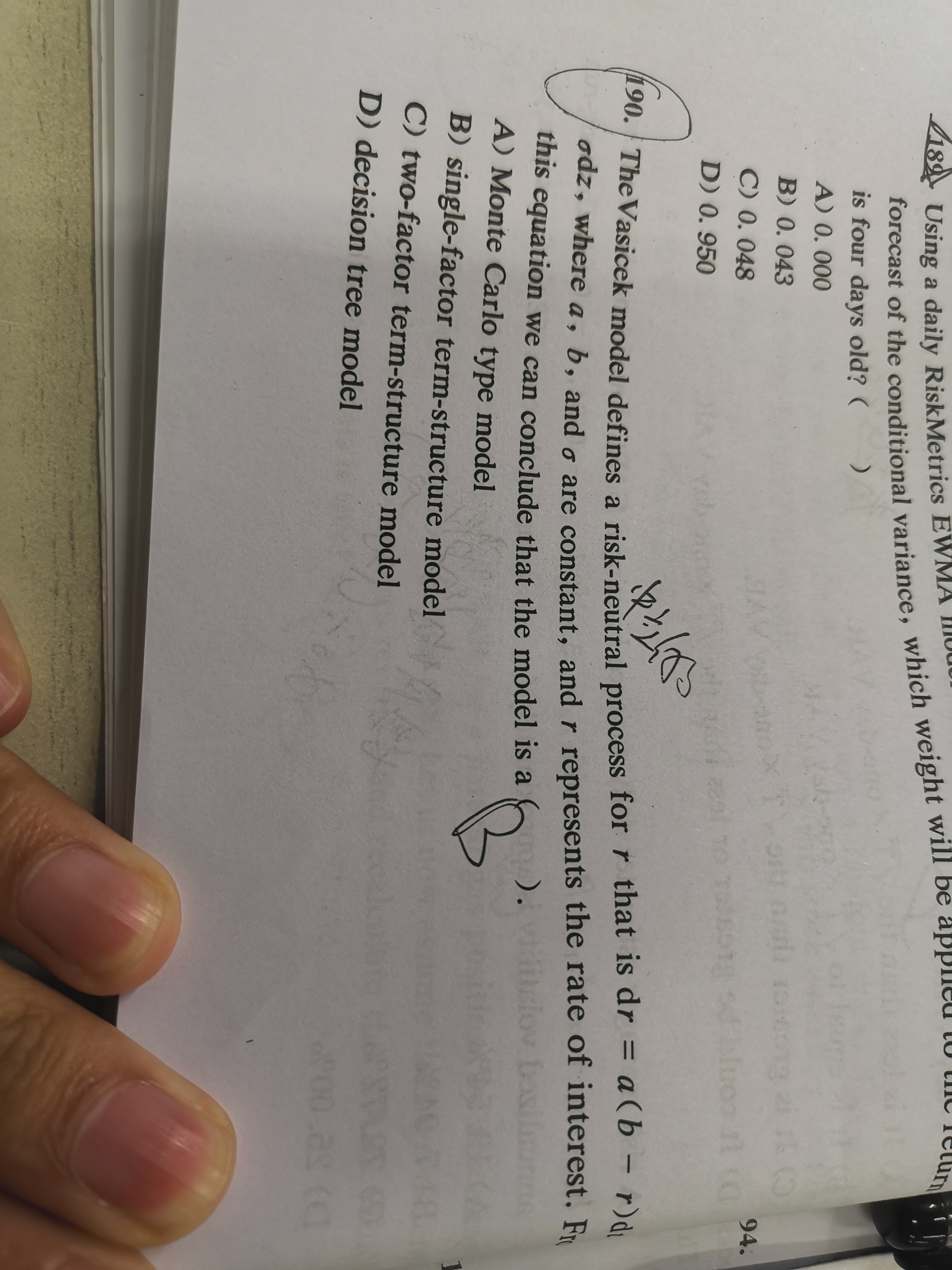 同学,A选项是蒙特卡洛模型,B选项是单因素期限结构模型,C选项是多因素期限结构模型,D选项是决策树模型哈