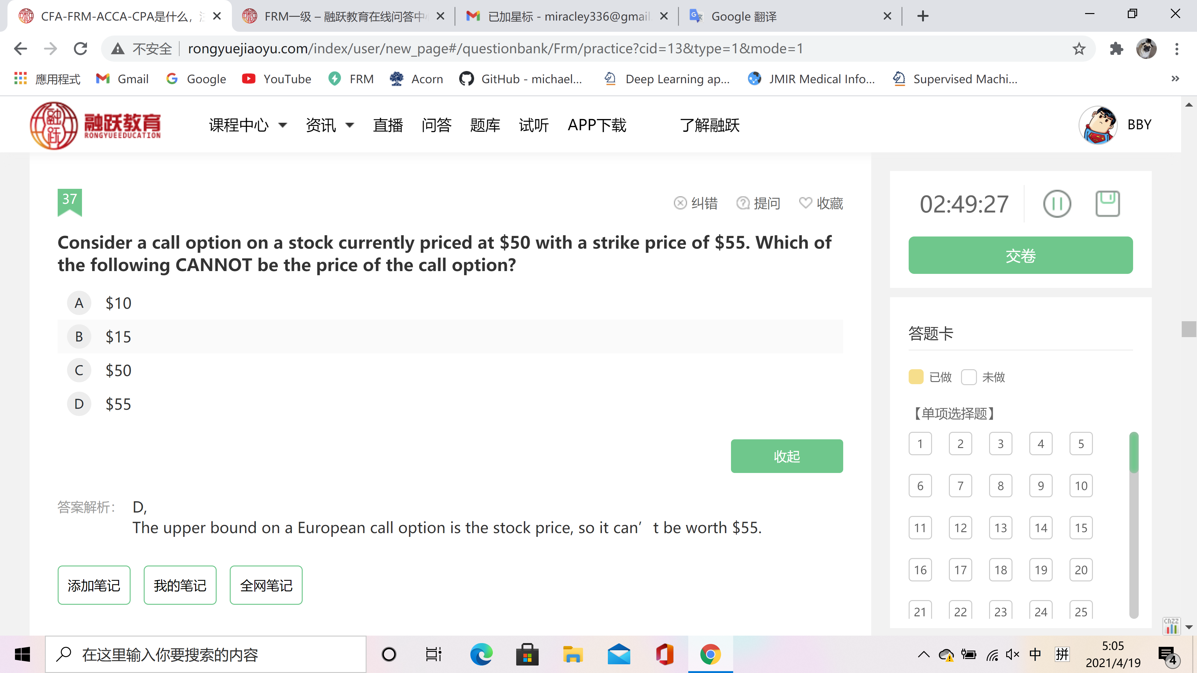 对的同学,stock price是50,问看涨期权的上限就是S=50,所以55超出50,是不可能达到的
