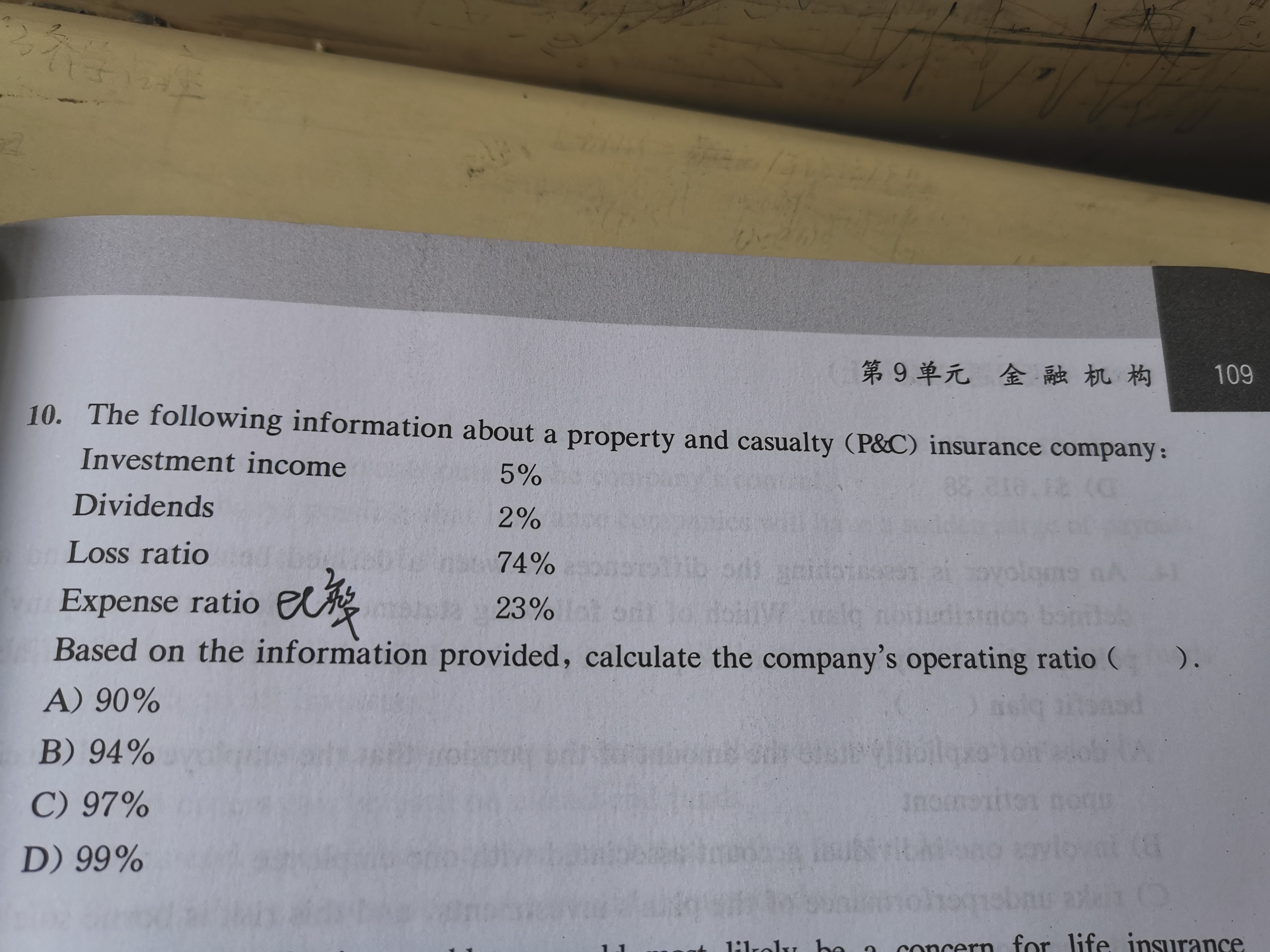 同学,经营比率等于承保损失率加上费用率加上股利支付率减去投资收益率等于74%+23%+2%-5%=94%,合并比率等于承保损失率加上费用率等于74%+23%=97%,分红后合并比率等于承保损失率加上费用率加上股利支付率等于74%+23%+2%=99%