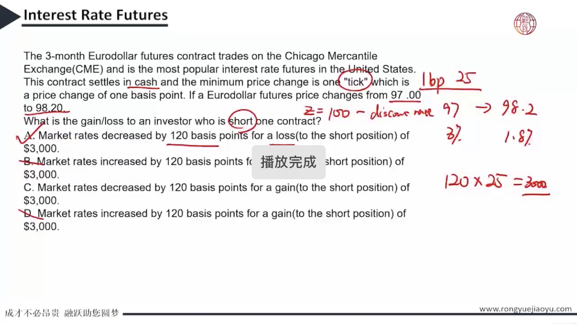 同学,欧洲美元期货利率上升一个基点,报价下降0.01元,价值下降为Tick size = $1 million×0.01%×90/360=$25
