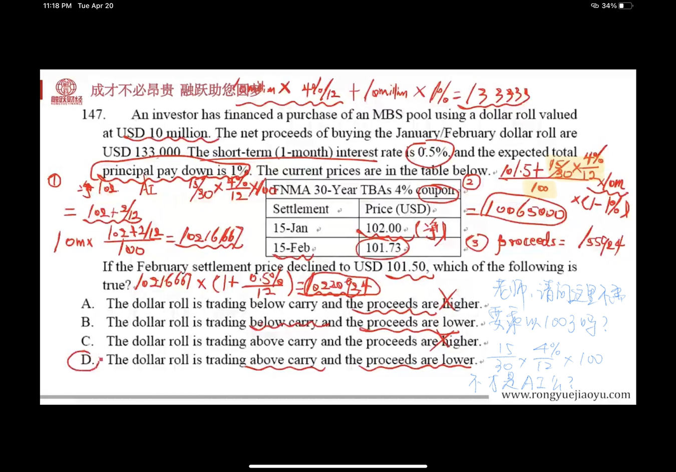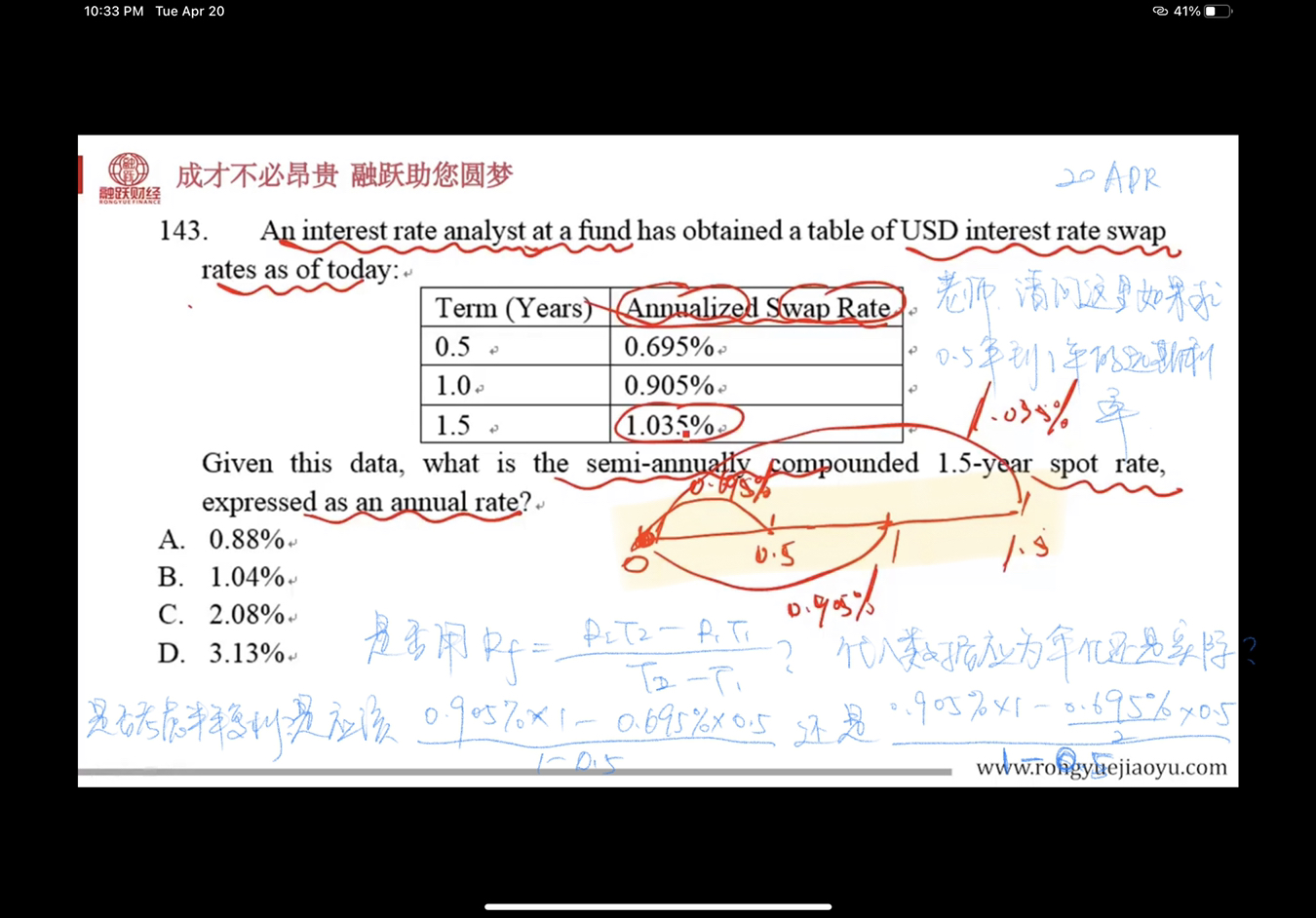 在离散复利的情况下,计算远期利率的公式是:(1+R1)×(1+F1,2)=(1+R2),然后再根据情况是否要除以n。图2的问题,是要乘以100的,老师忘记写了,结果是一样的。
