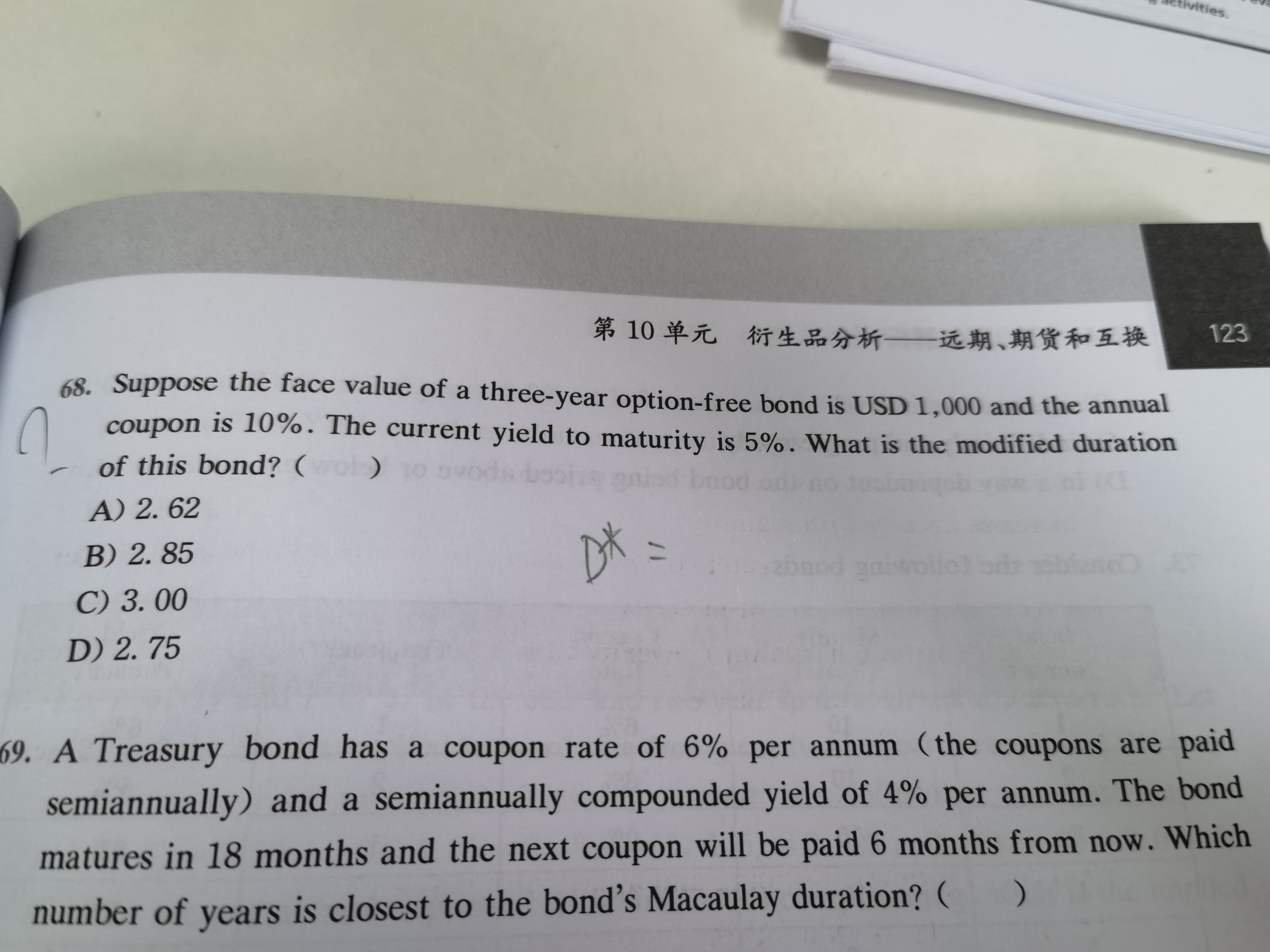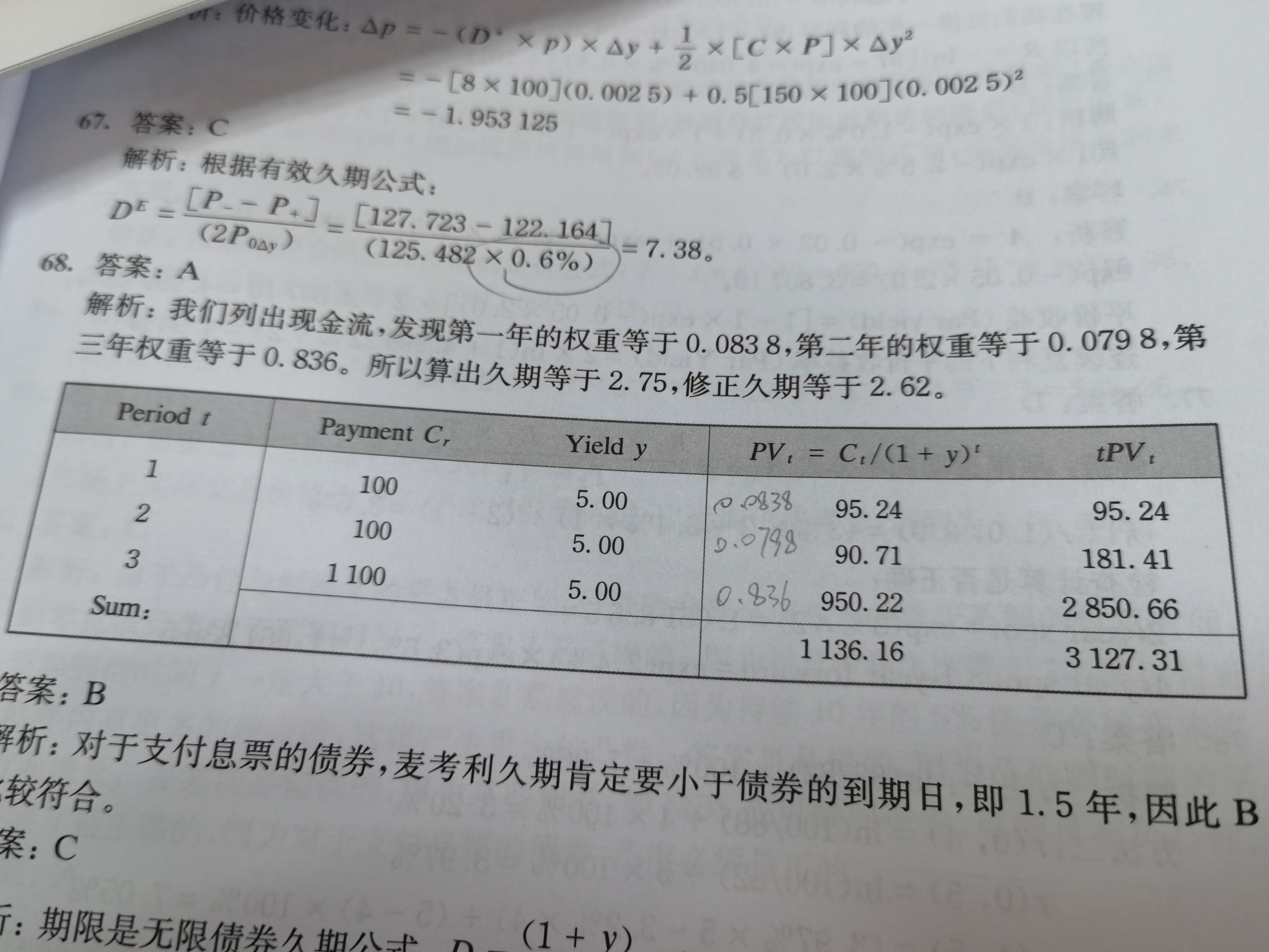 同学你好,计算出来各个期限对应的权重后,再乘以对应的期限然后加总就是麦考利久期,最后再除以(1+r)就是修正久期。 详细如下:(0.0838×1+0.0798×2+0.836×3)/(1+5%)=2.62