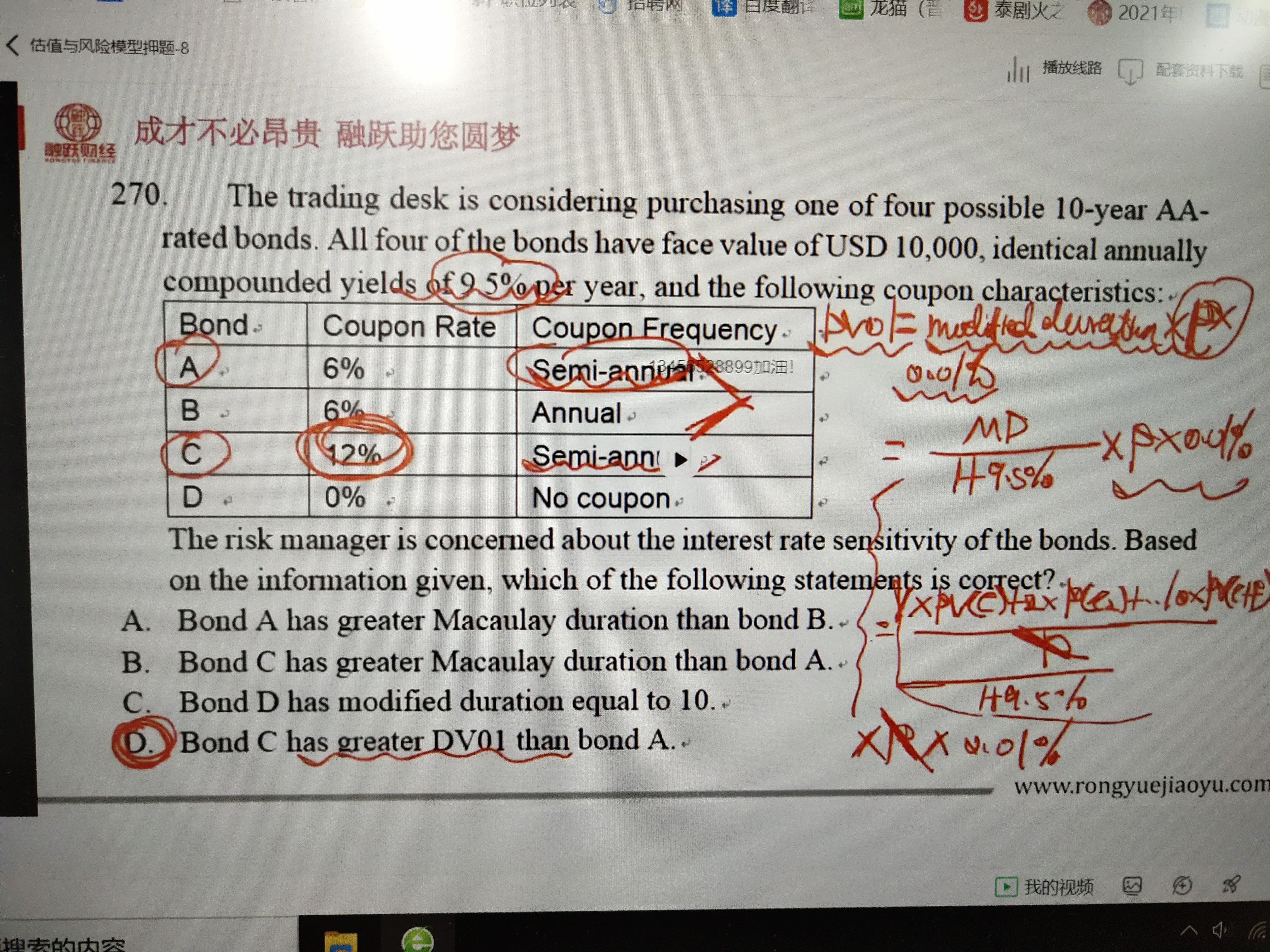 同学你好,视频中老师提到了这一点,单从DV01的计算公式:修正久期*P*0.01%,主要取决于修正久期的大小和价格P,票息与修正久期成反比,与价格成正比,但是一般情况下票息对价格的影响大于对久期的影响,所以,相对而言,票息率越高的债券其DV01越大。如果要更精确一点的结论,就是视频中老师进一步推导出来的结论,折现现金流越大(即票息率越大)的债券其DV01越大。
