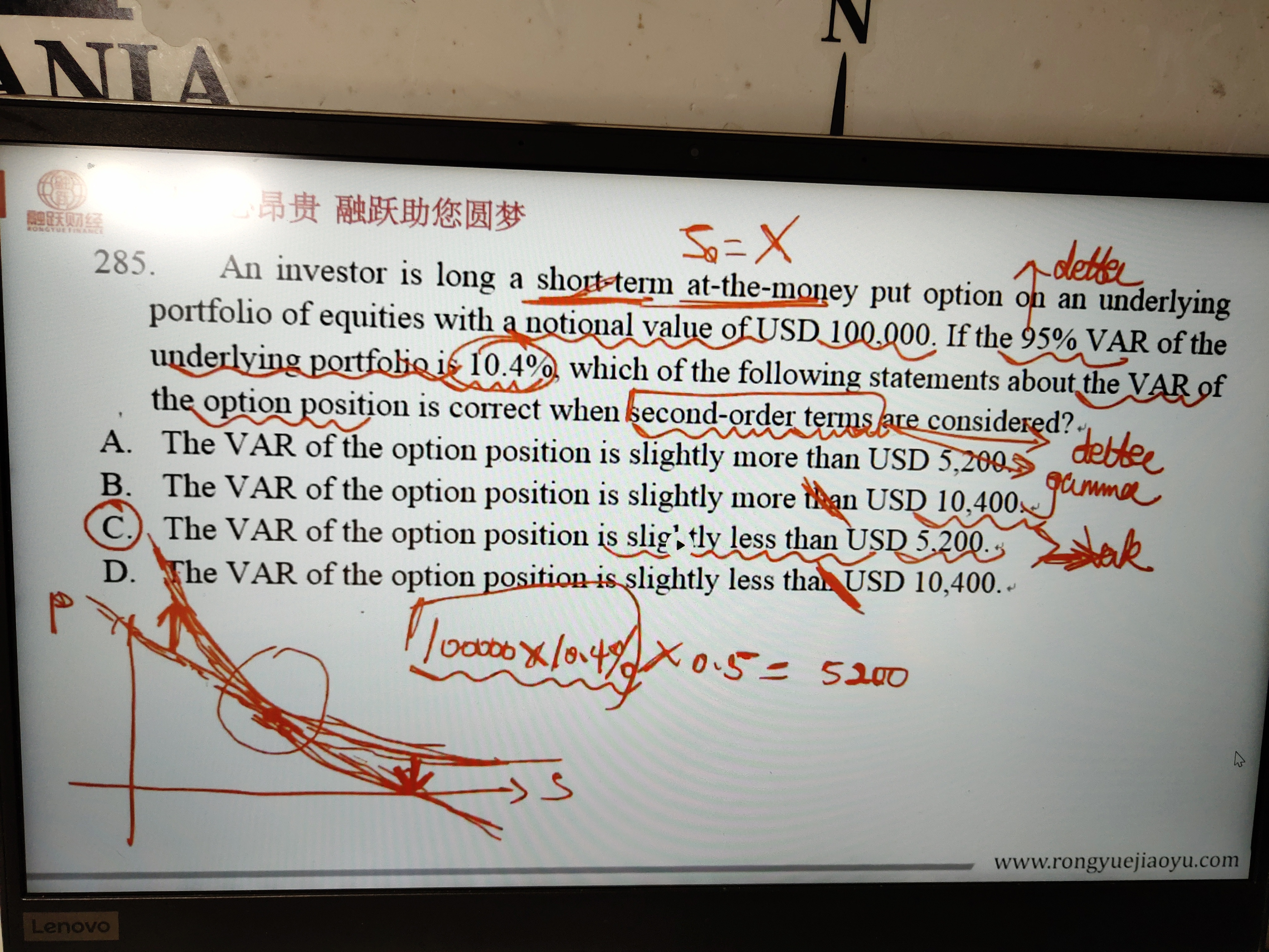 同学你好,这道题考察的是同时考虑delta(一阶)和gamma(二阶)对期权VAR的影响,也就是用delta-gamma法计算期权 var(put)=delta*var(ds)-1/2*gamma*var(ds)^2,带入公式VAR=0.5*10000*10.4%--1/2*gamma*var(ds)^2=5200--1/2*gamma*var(ds)^2,由于1/2*gamma*var(ds)^2大于0(因为多头的看跌期权的gamma值大于0),所以最后计算出来的期权var是小于5200的,所以只考虑一阶影响时是高估VAR