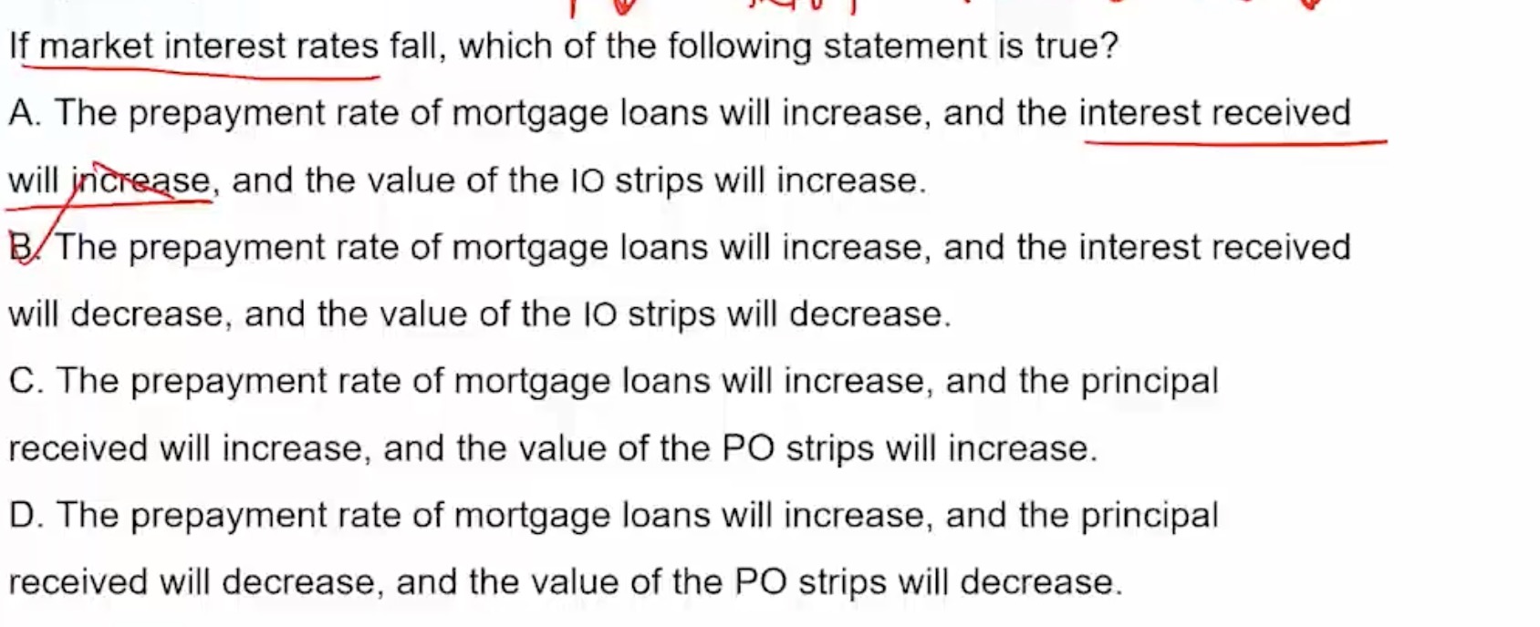同学你好,当市场利率下降,提前还款率上升,导致房贷资金池中的本金价值下降,所以PO strips(本金价值)也将下降,所以C错。